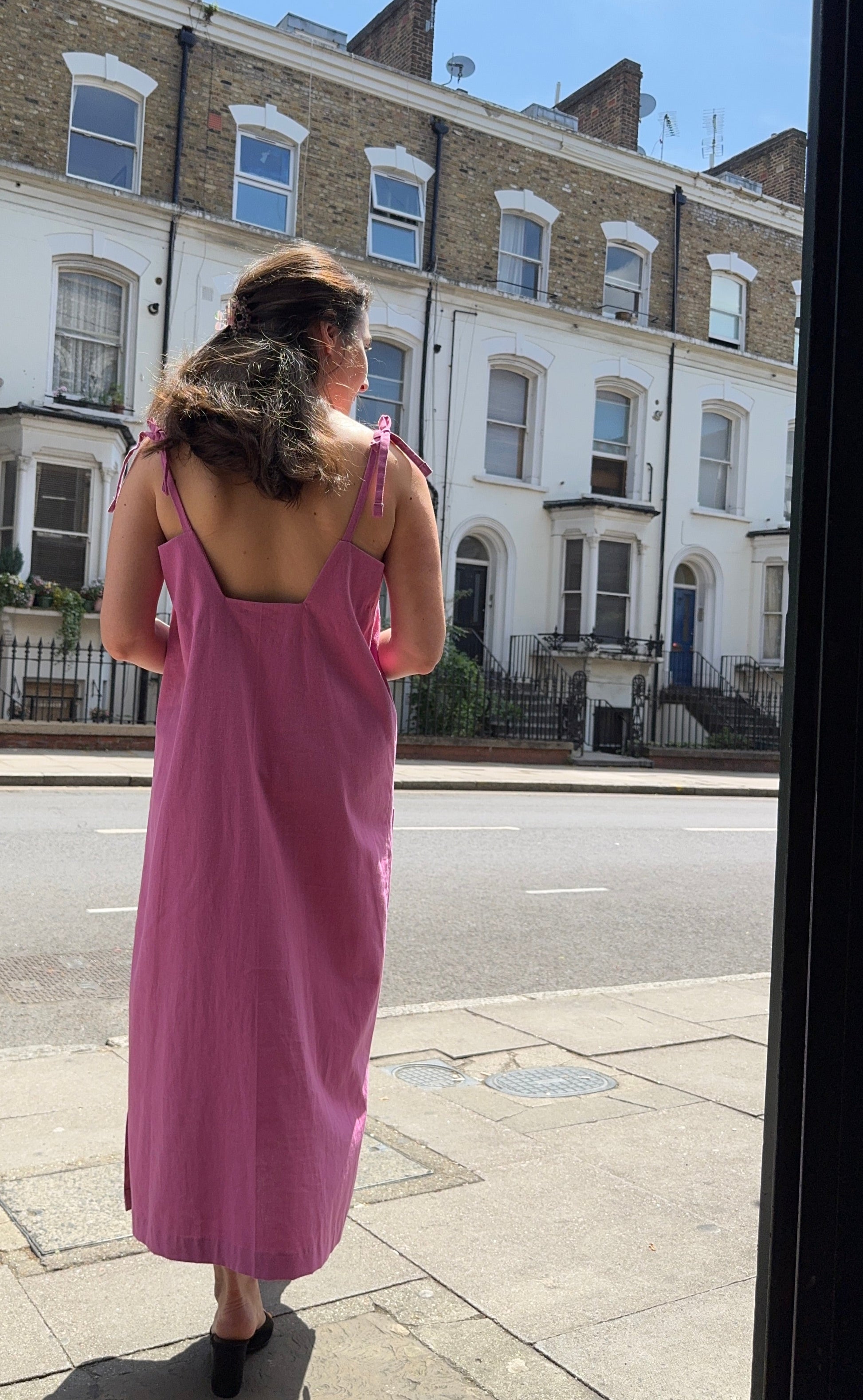 Comfortable and airy dress with adjustable shoulder ties, two front pockets and side slits. Super flattering A-line shape which makes moving about and doing stuff easy.