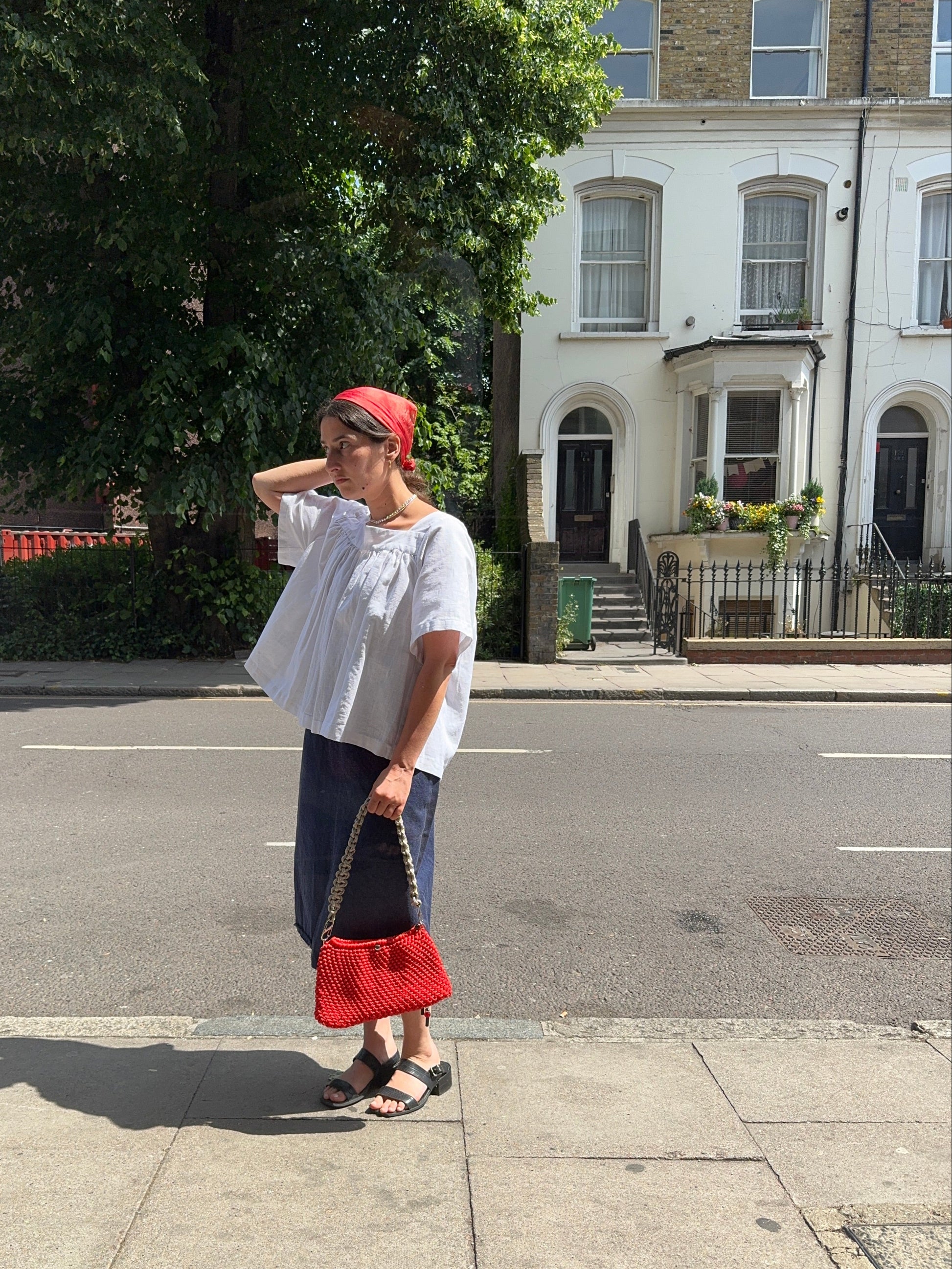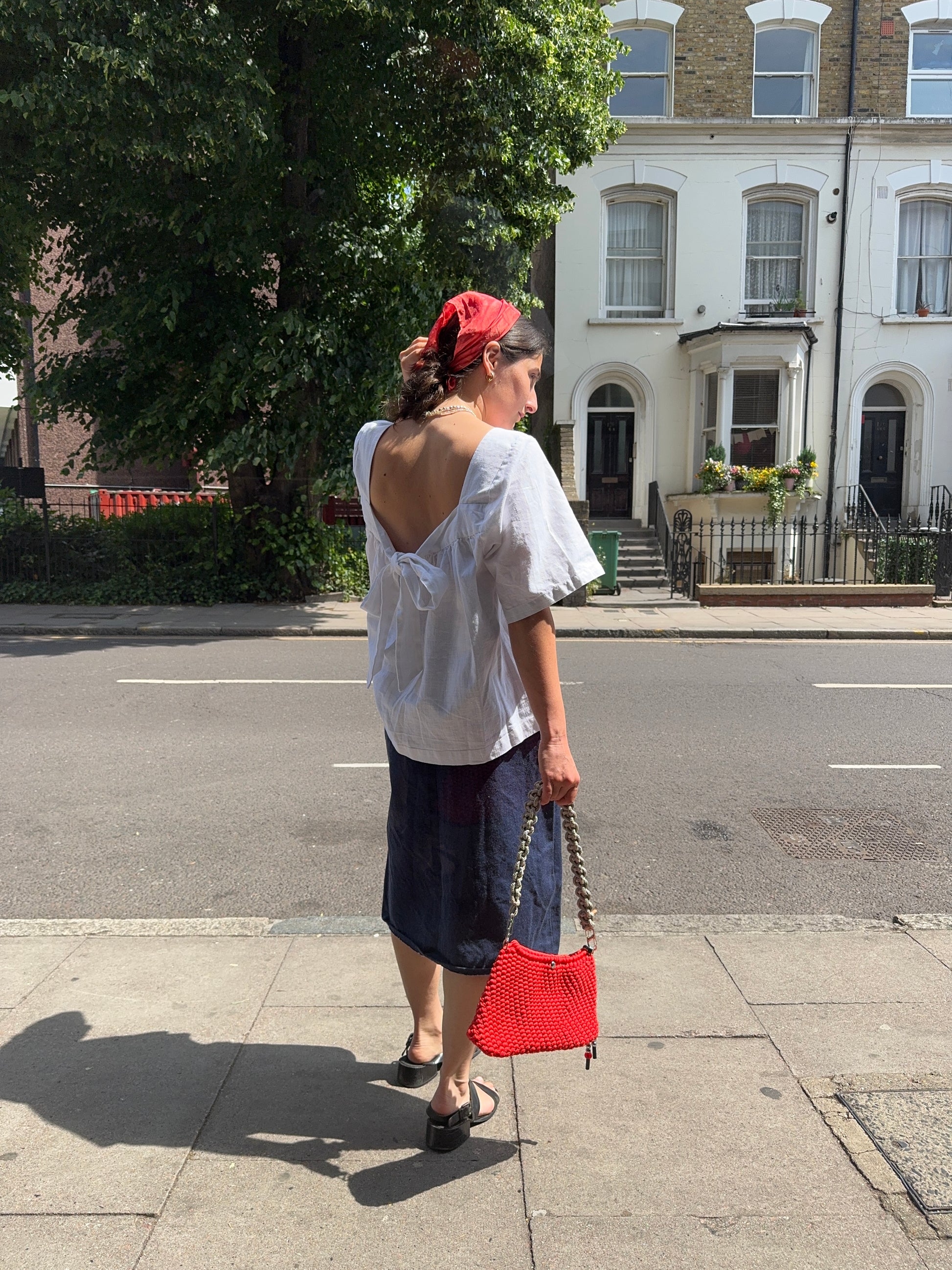 Floaty gathered blouse with wide sleeves, back bow and square neckline, which can be worn both ways around,