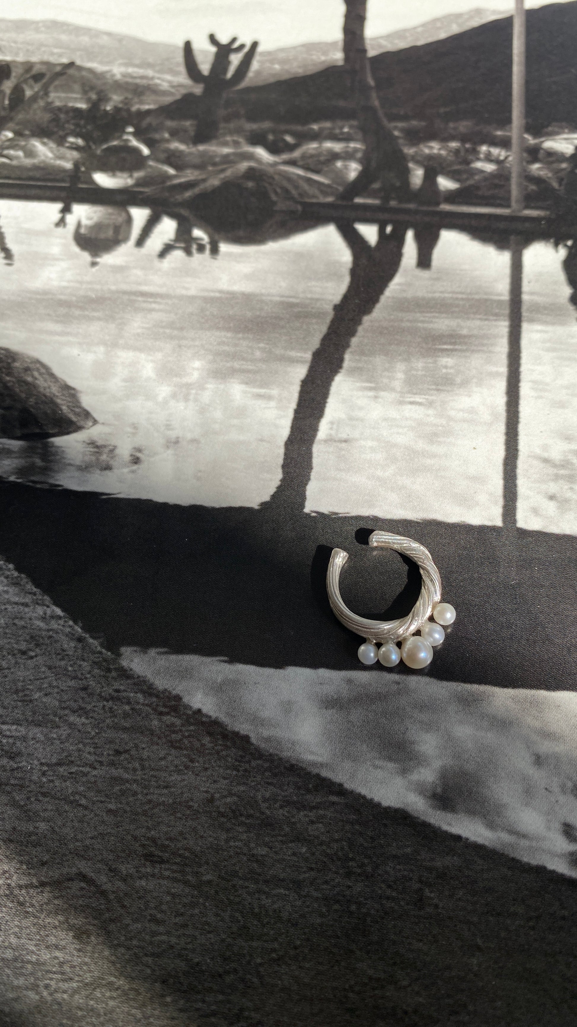 This ear cuff is inspired by the delicate beauty of fresh blossoms hanging from tree branches, capturing the essence of renewal, growth, and new beginnings. Crafted with graceful, organic lines, the cuff wraps gently around the ear, evoking the natural flow of blossoms in bloom. Pearls are artfully set into place.