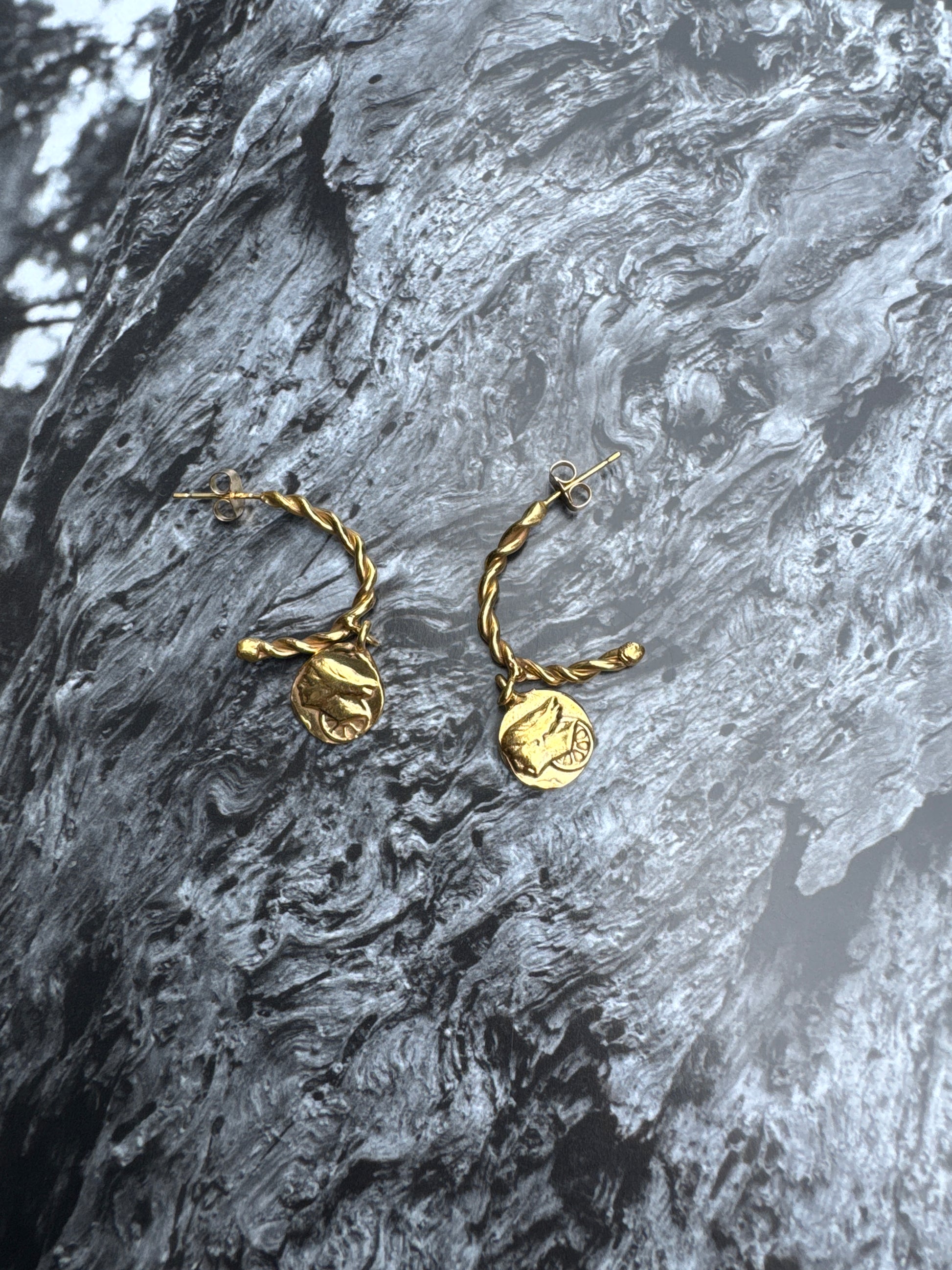 The La Dea Bendata ( blindfolded goddess ) charms twisted hoops in this picture are hand carved using the old age lost wax technique, casted in solid bronze and finally gold plated in 18ct yellow gold.