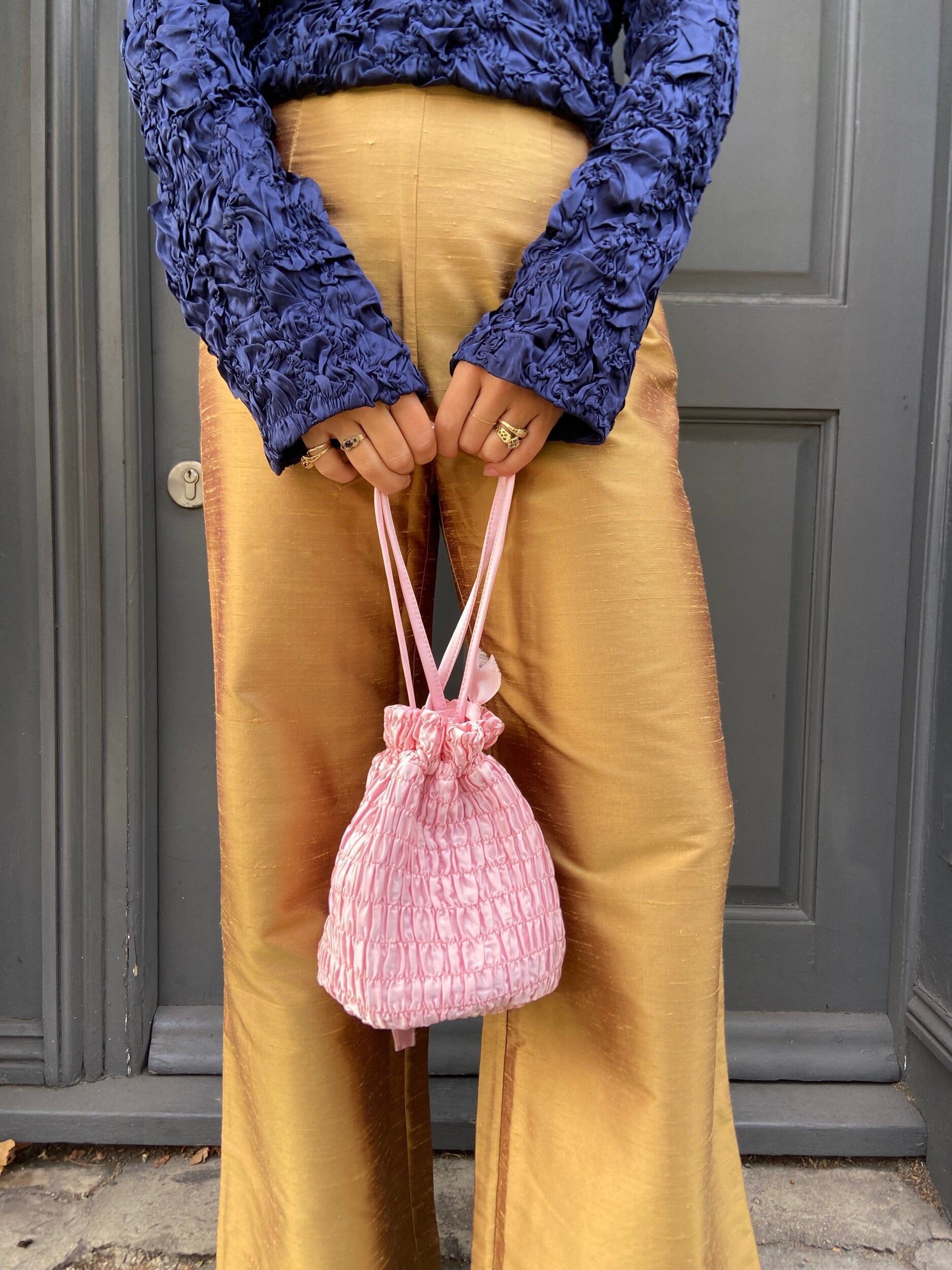 The perfect drawstring bag to safely nestle any of your essential treasures. Pair it with a Rosekumo knit cardigan for the ultimate dream team. The strap is long enough to wear it over your shoulder and the bag is big enough to fit your essentials.