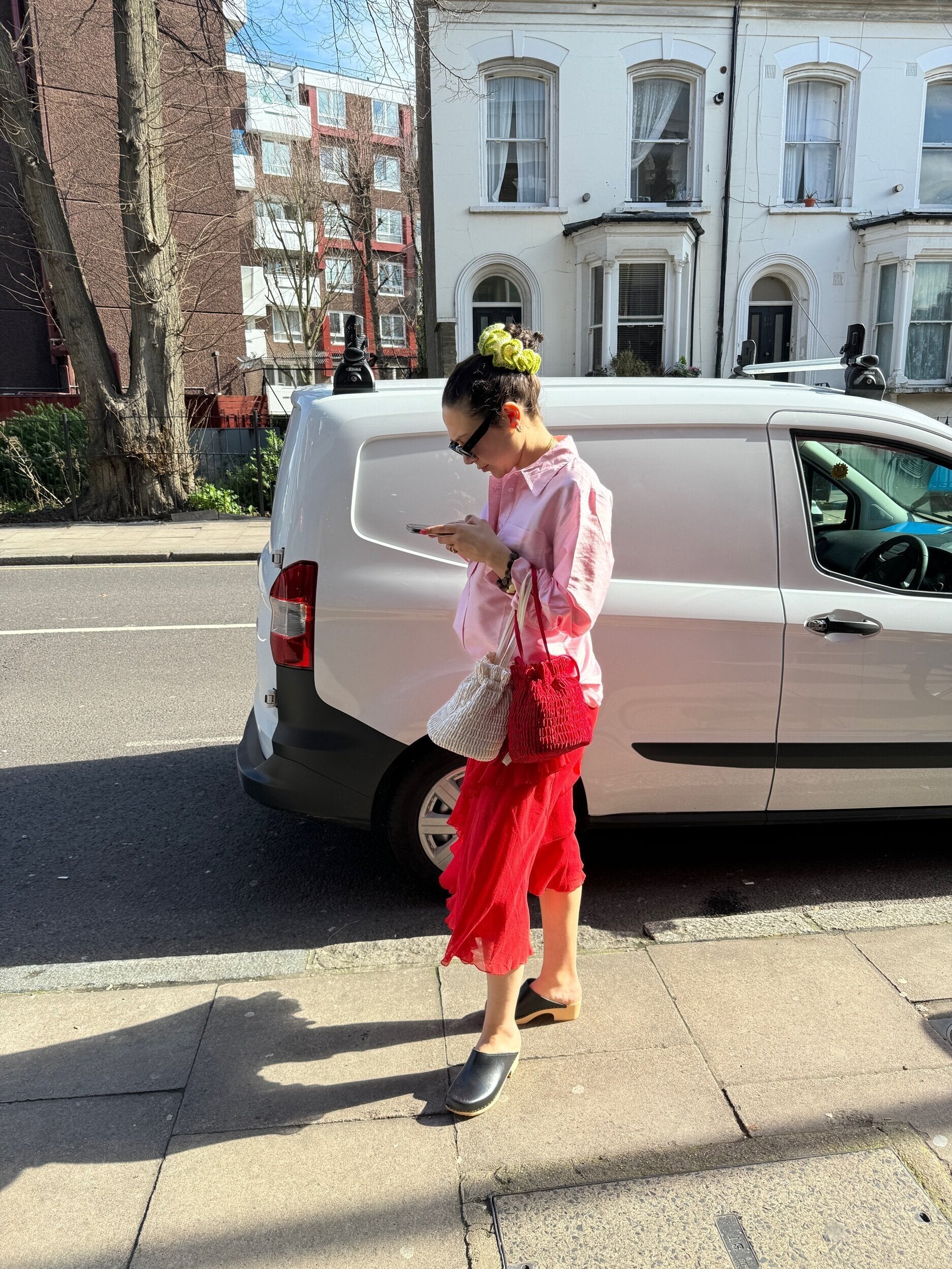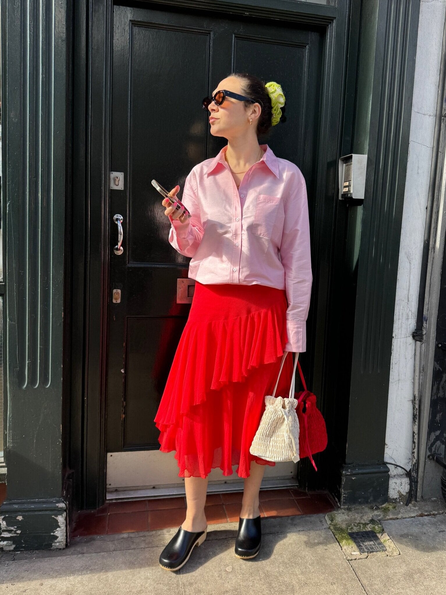 The Cecilia skirt in red is crafted from cotton tulle and features layered diagonal ruffles. The skirt sits slightly fitted around the hips and falls to create a flowy silhouette.