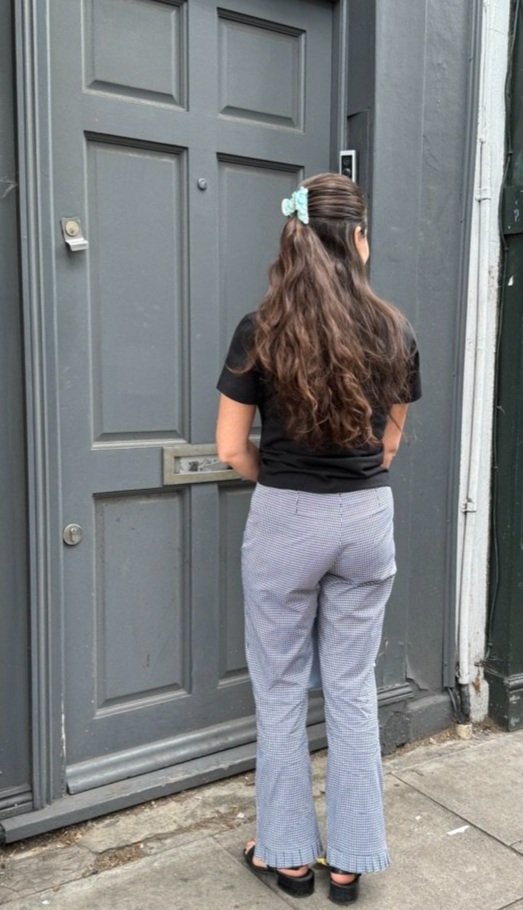 The Elouise trousers in black and white gingham are crafted from soft cotton. They feature two front seams and flat ruffles around the hem of the legs. Size up for a more relaxed fit