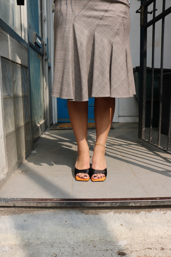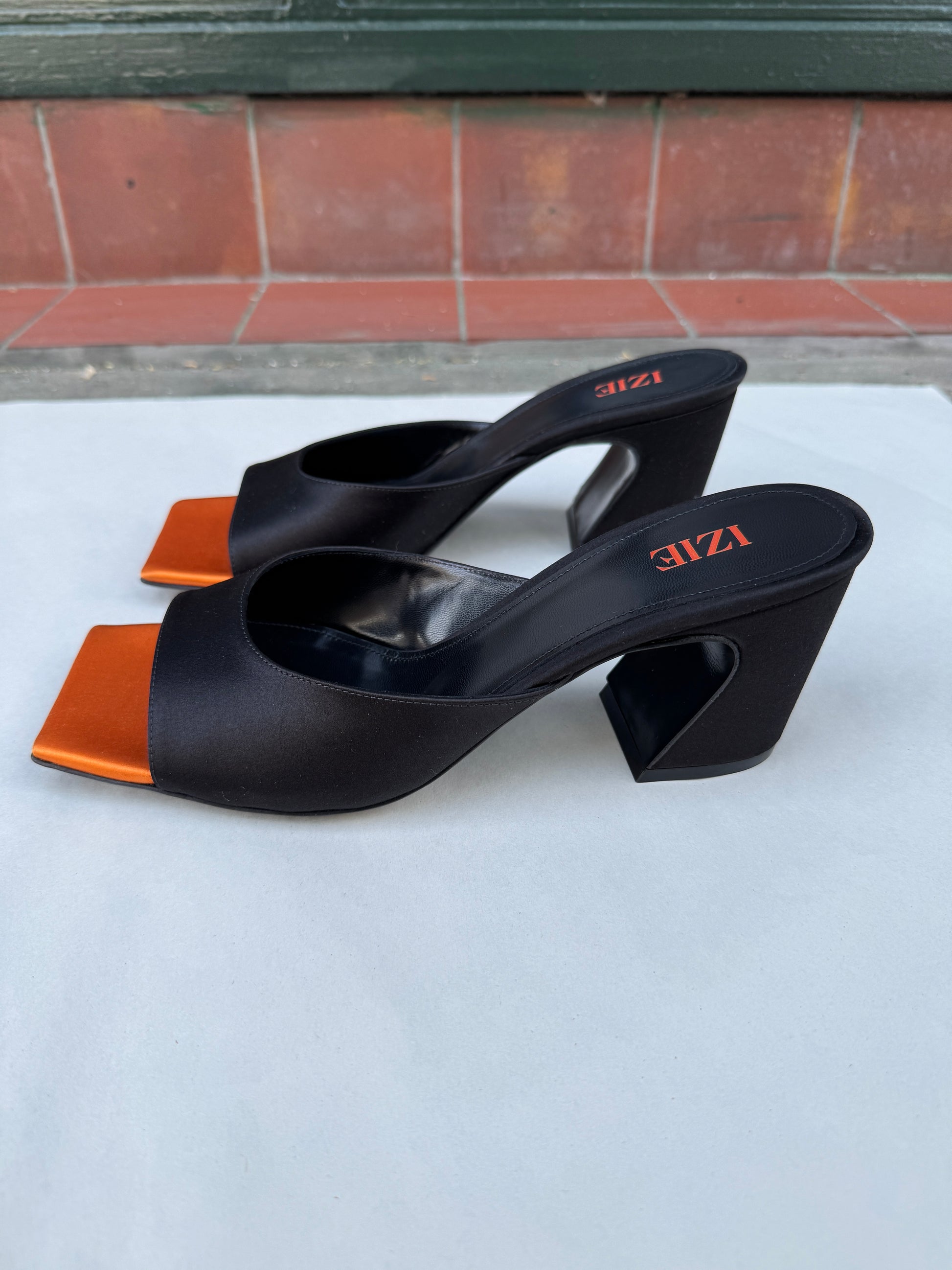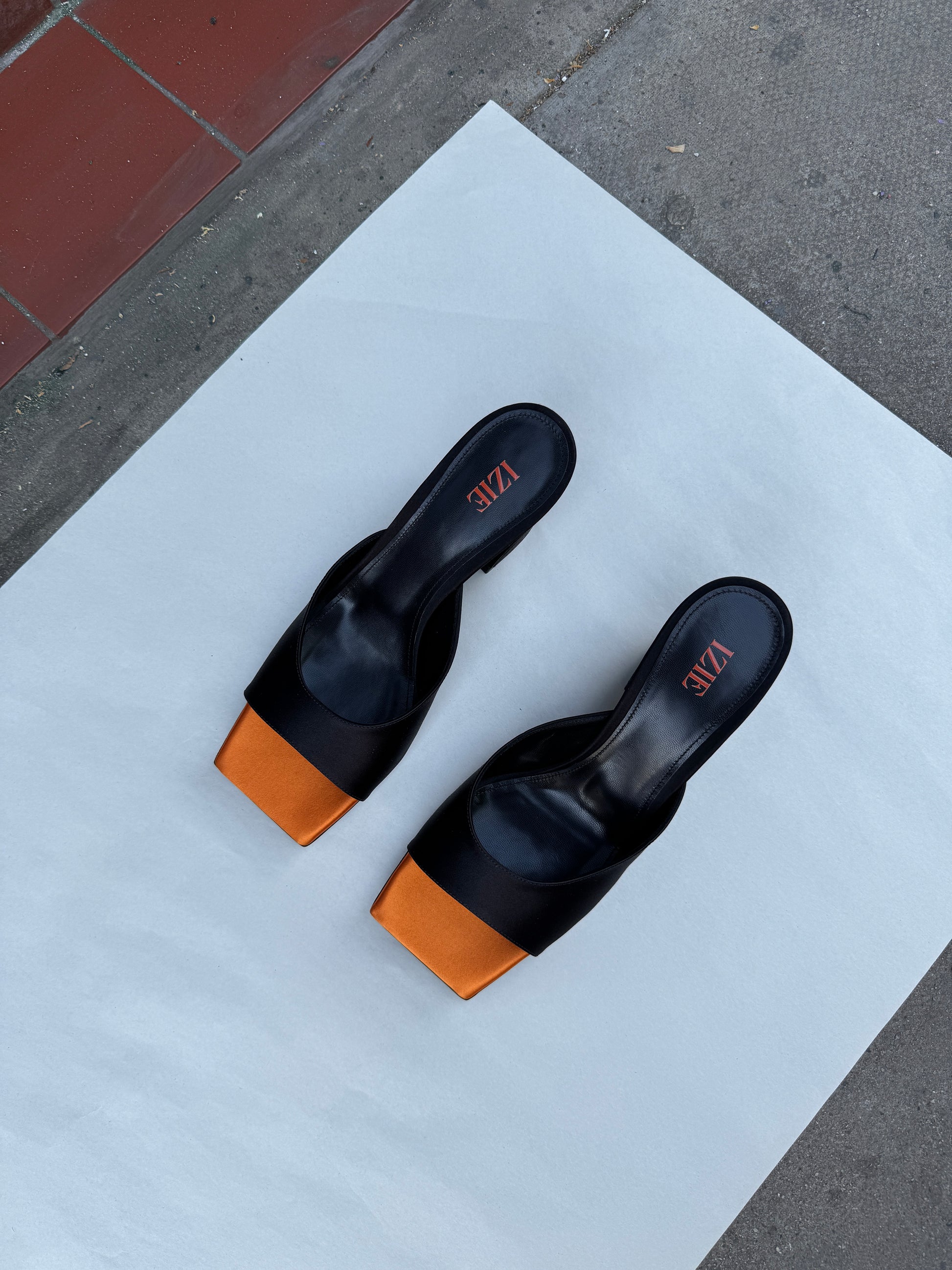 This easy-to-wear slip-on style was made to move in. Crafted in elegant black satin with a contrasting orange satin toe, the Chester mule is suited for any occasion, day or night.