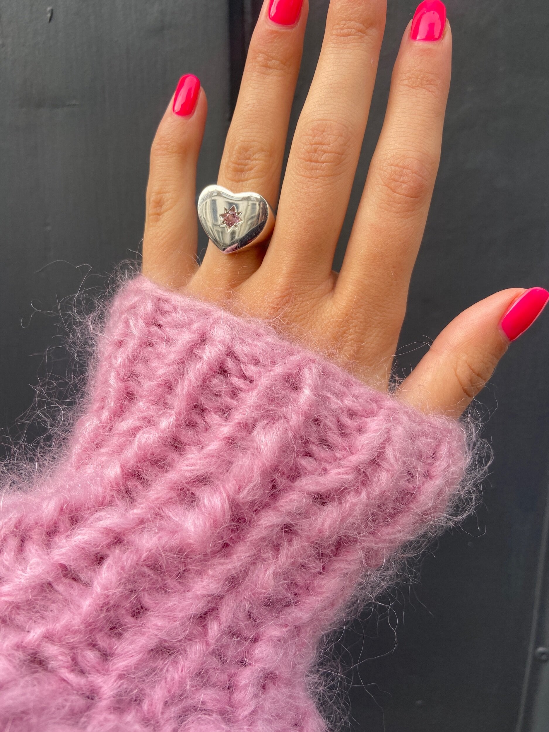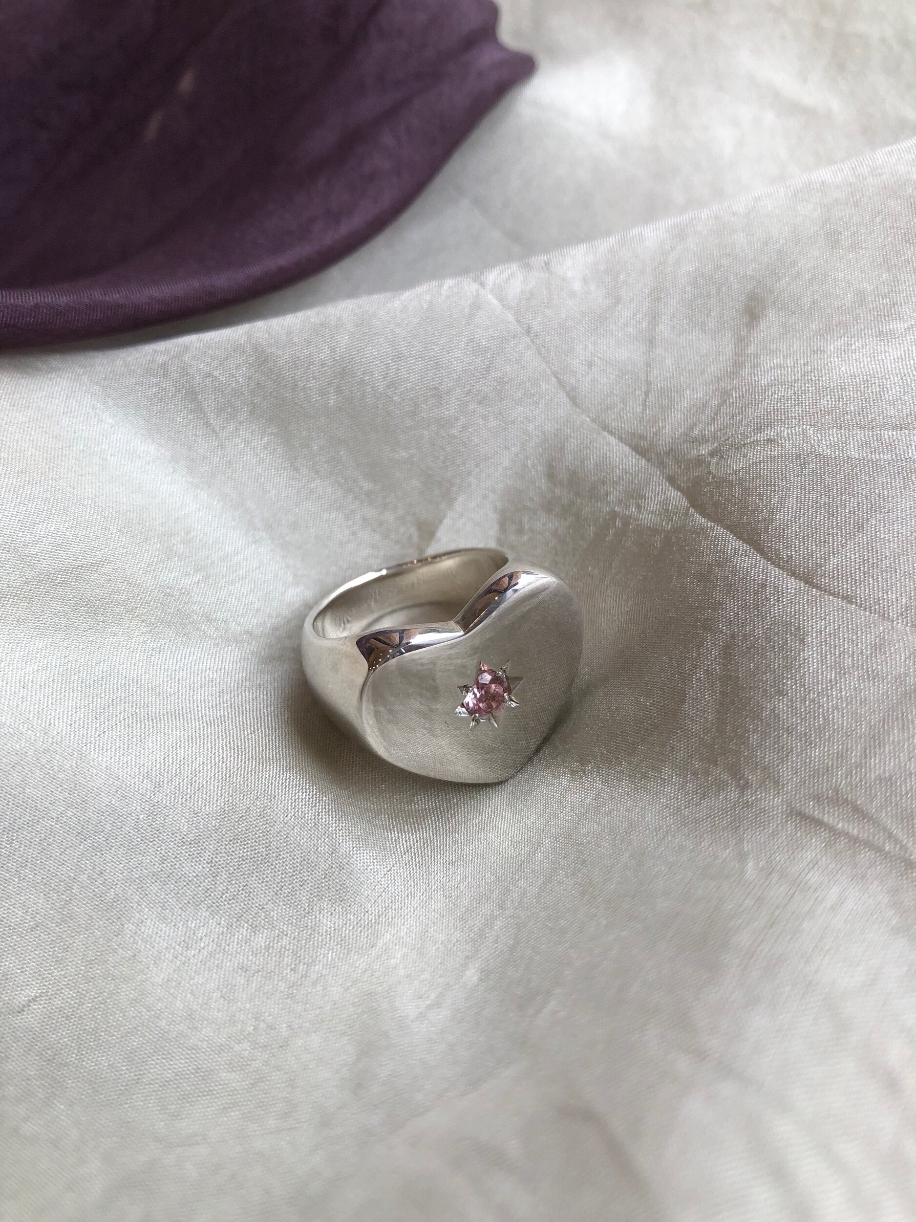Chunky heart shaped signet ring traditionally star set with a beautiful semi-precious pink tourmaline stone.