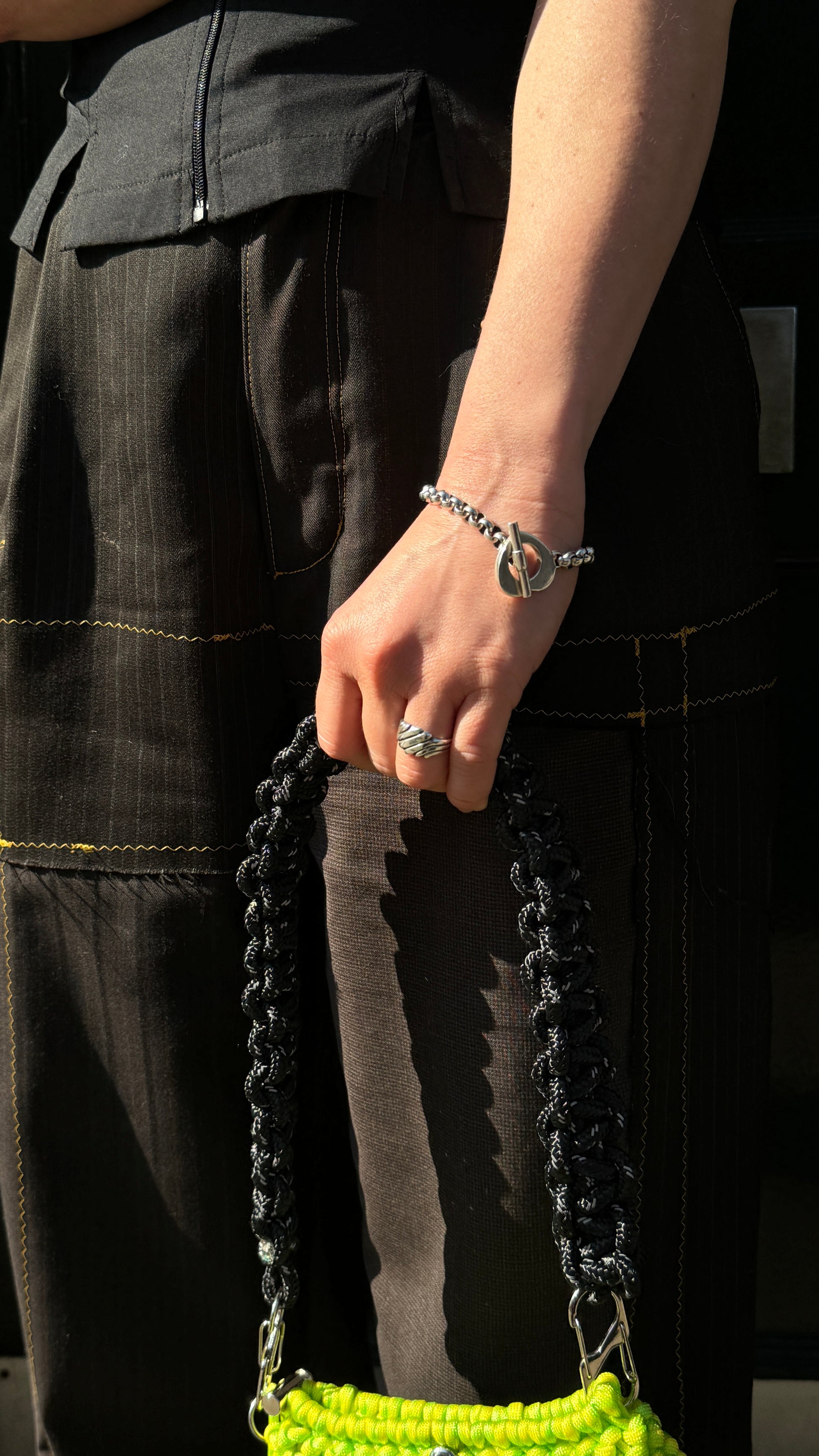 Zingy green & yellow small sized bag that fits your phone, keys and a couple other essentials. Comes with a chunky black reflective shoulder strap. Finished with stainless steel fastenings and glass beads.