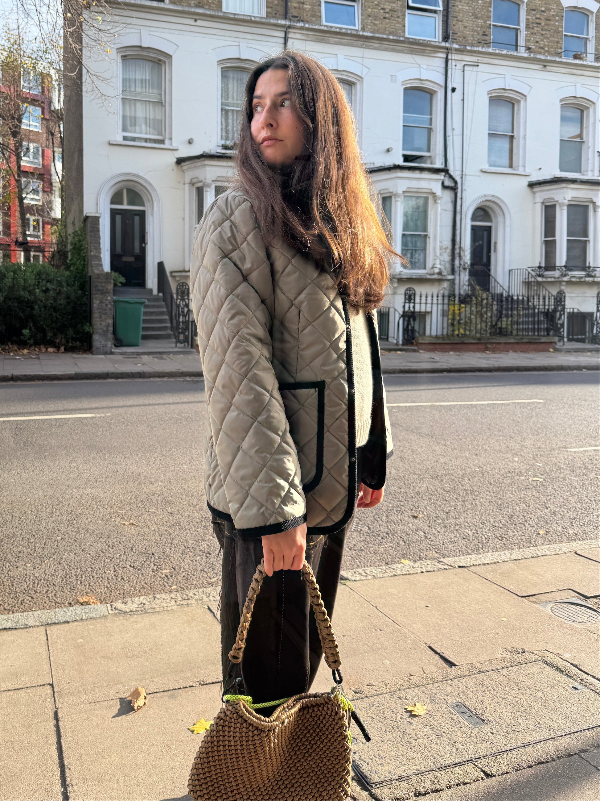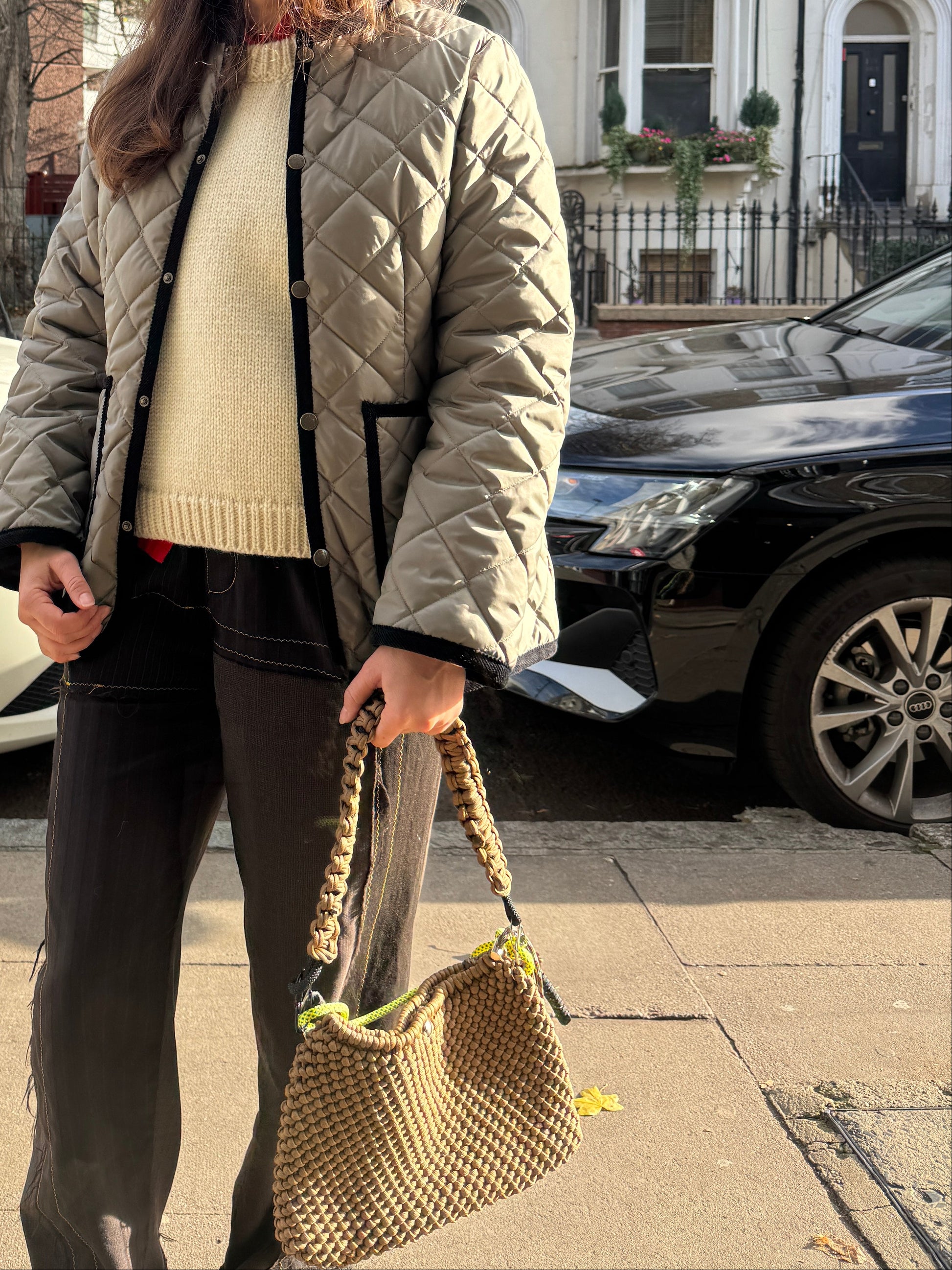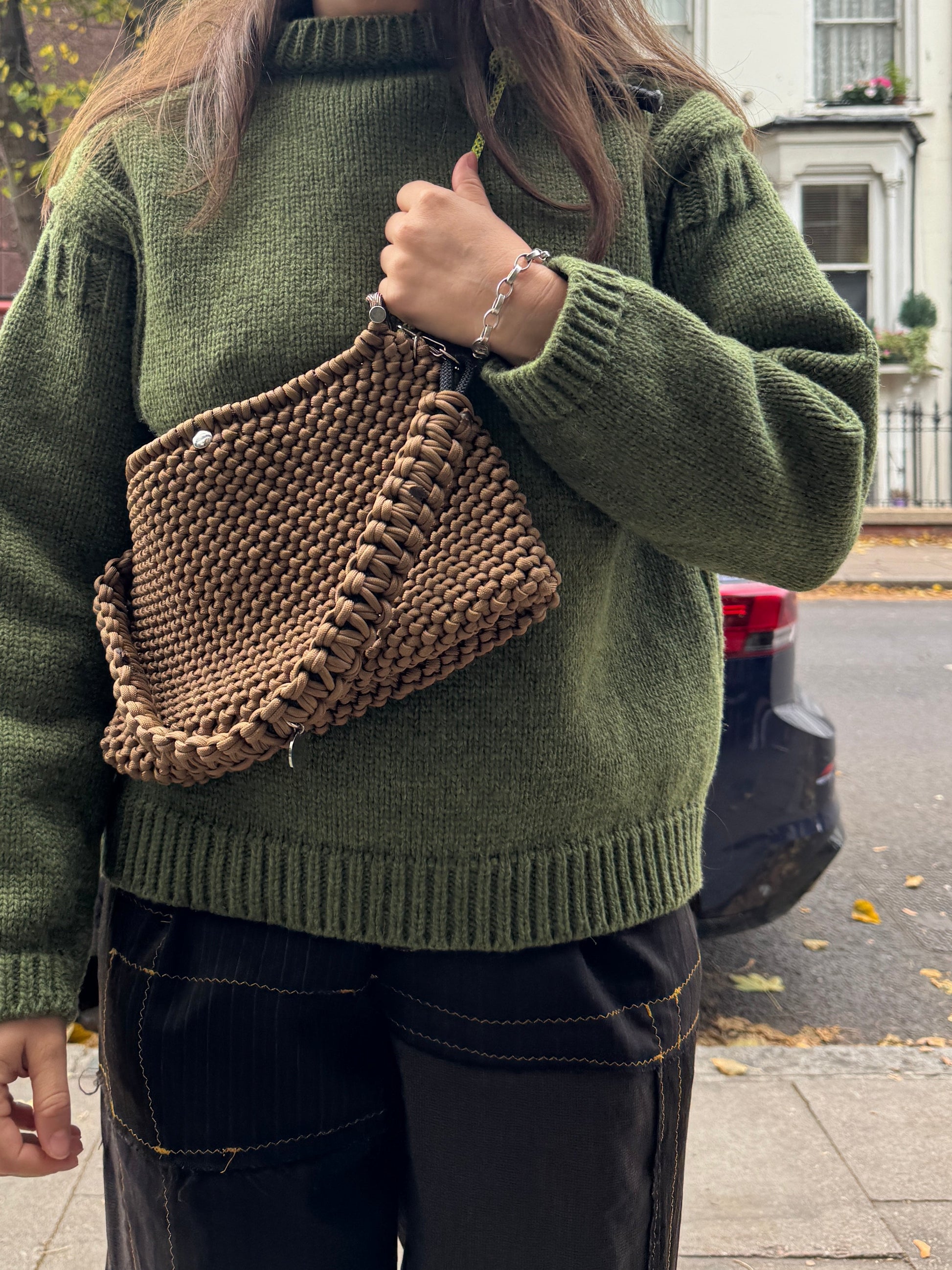 Brown paracord bag with chunky shoulder strap, neon green cross body strap and stainless steel fastenings and glass bead tassels. Big enough to fit all your essentials.