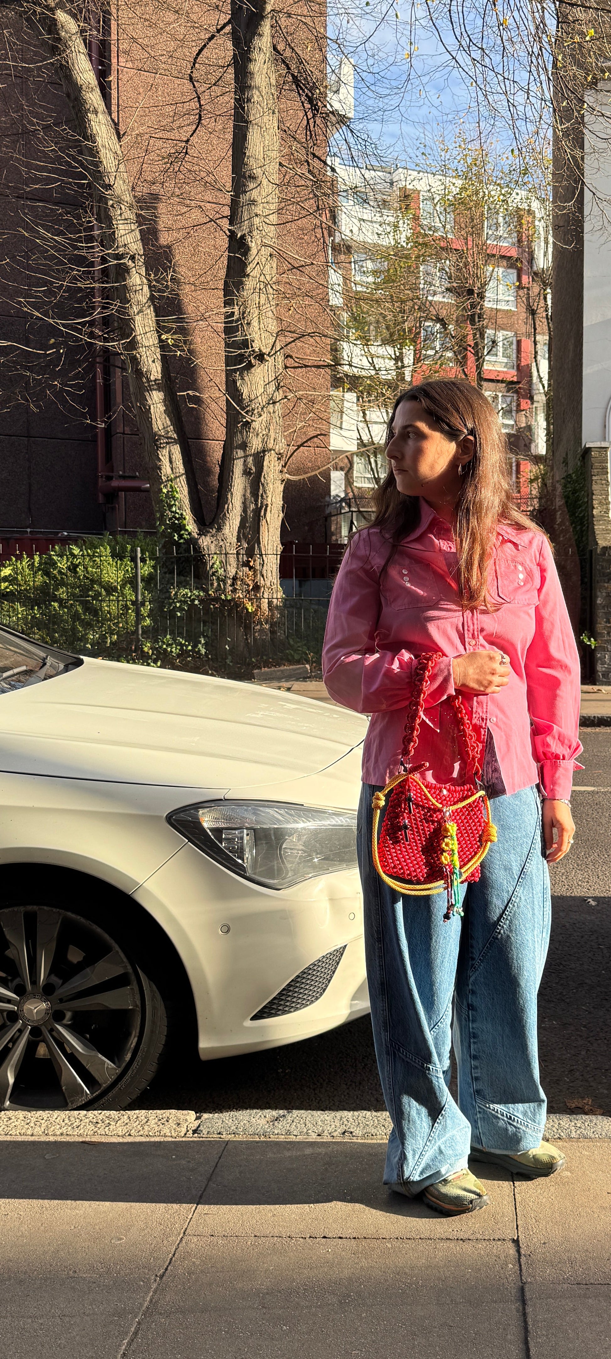 Red bag with chunky shoulder strap, adjustable orange cross body strap and stainless steel fastenings. Fits your phone, keys and a couple other essentials.