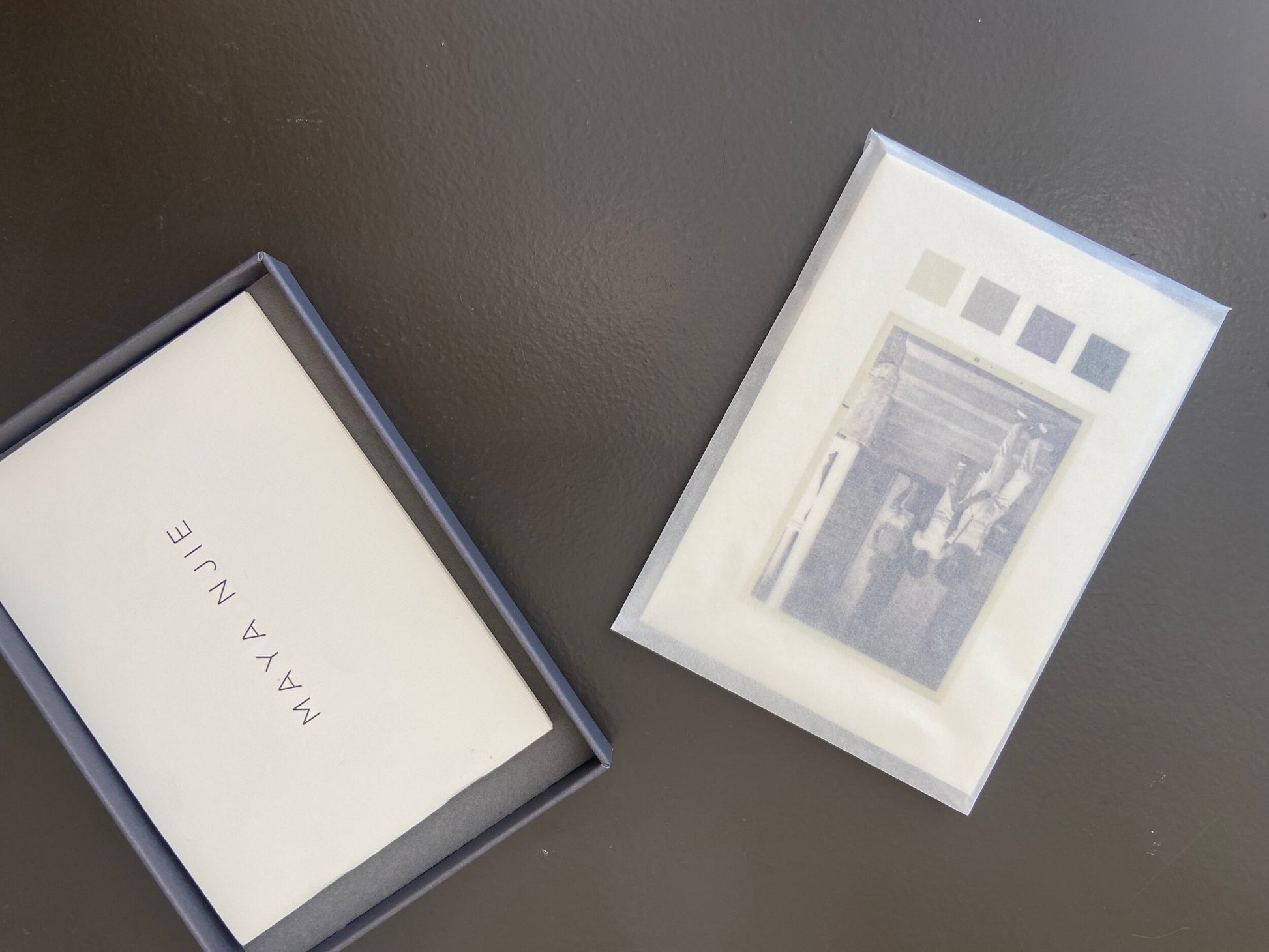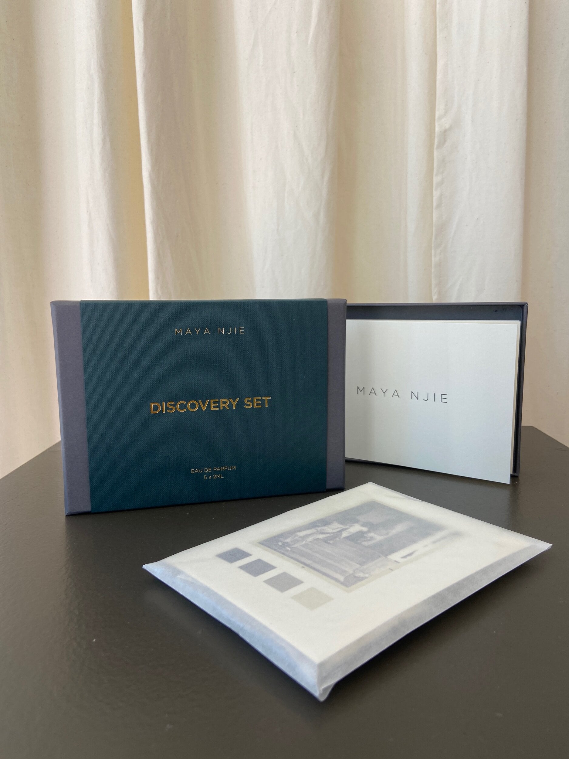 The box contains 5 x 2ml glass vials (Nordic Cedar, Vanilj, Les Fleurs, Tobak and Tropica) which are placed in a glassine envelope with an accompanying postcard. The box also holds a booklet containing the 5 photos that inspired these scents.