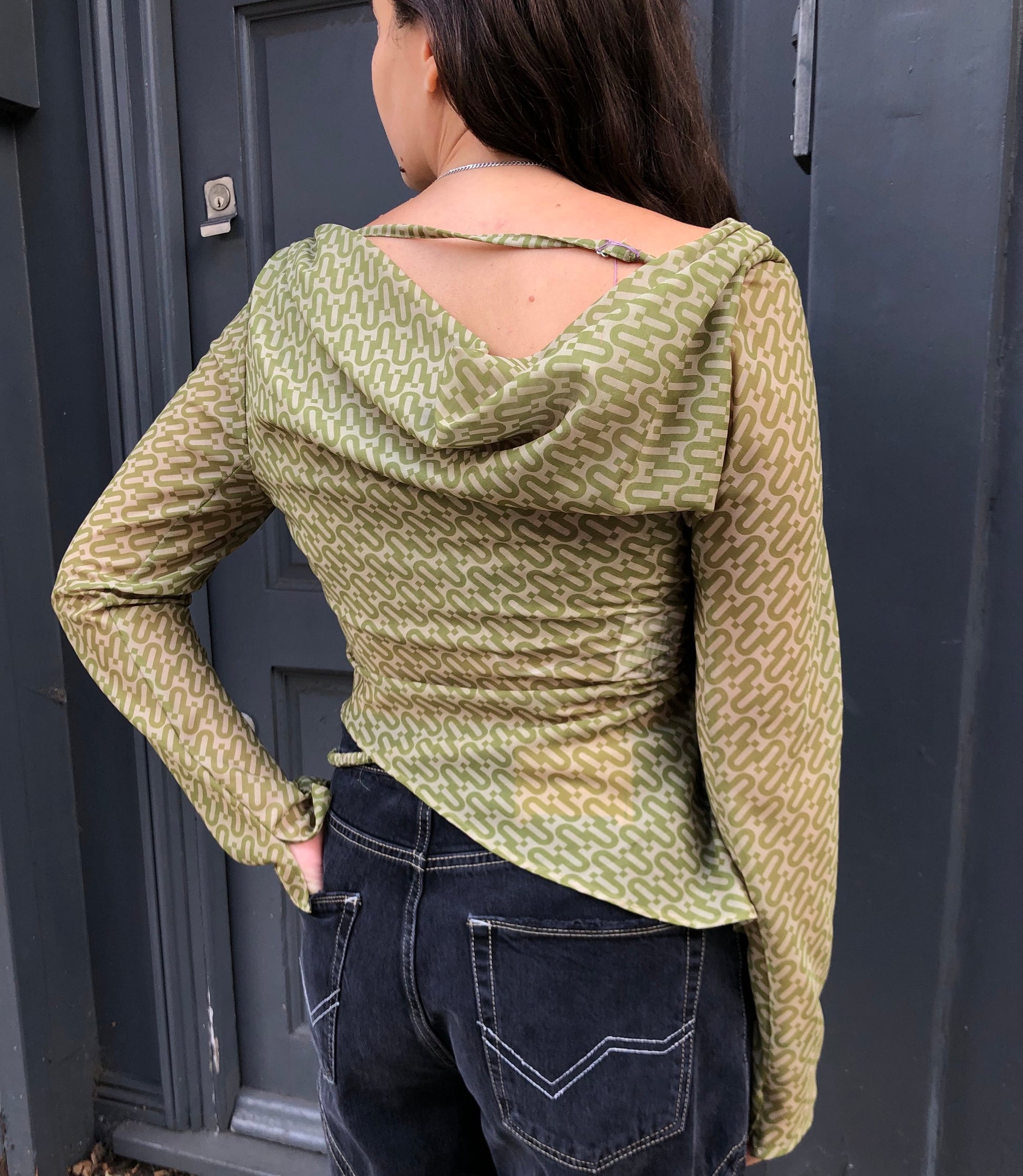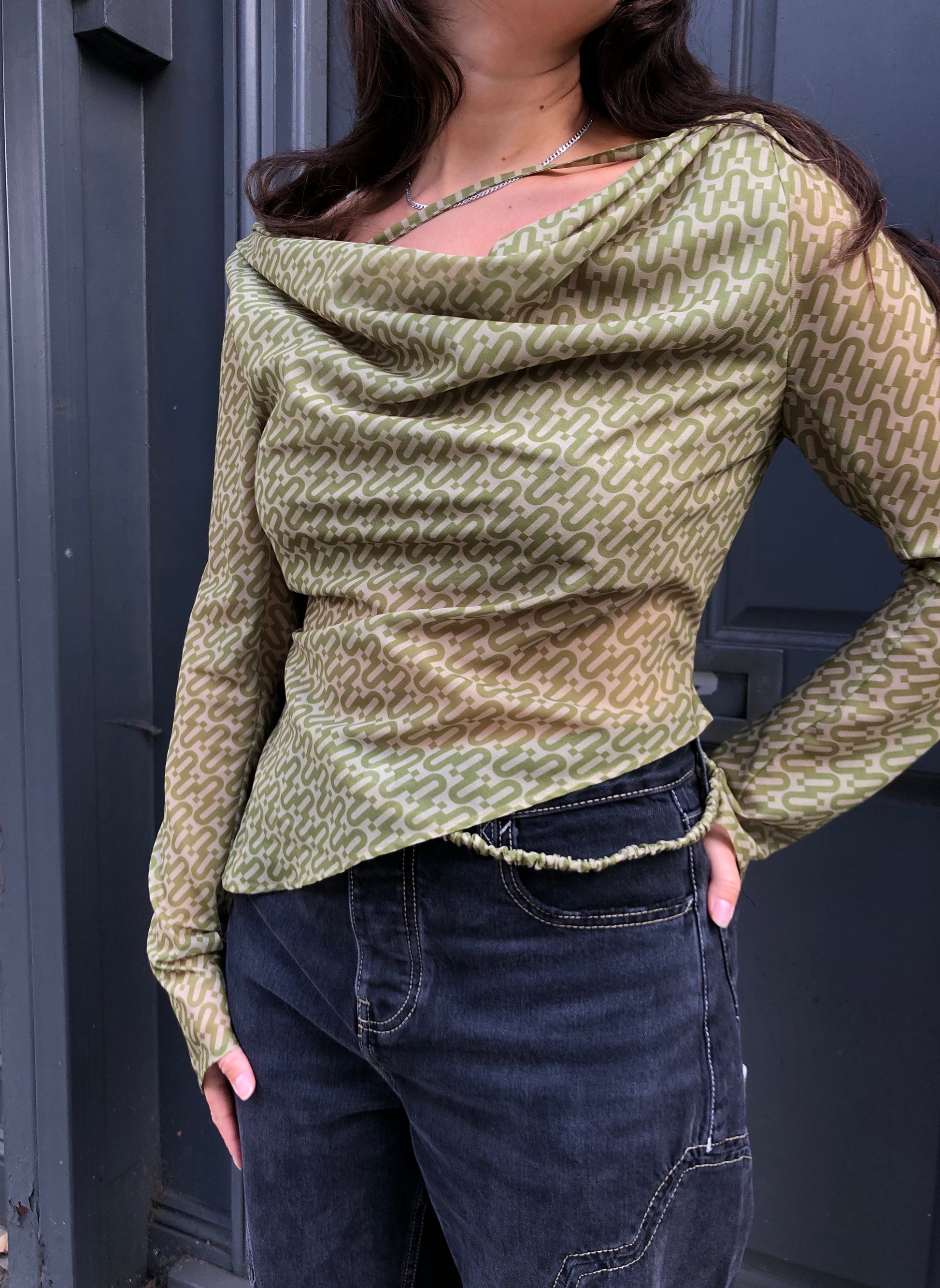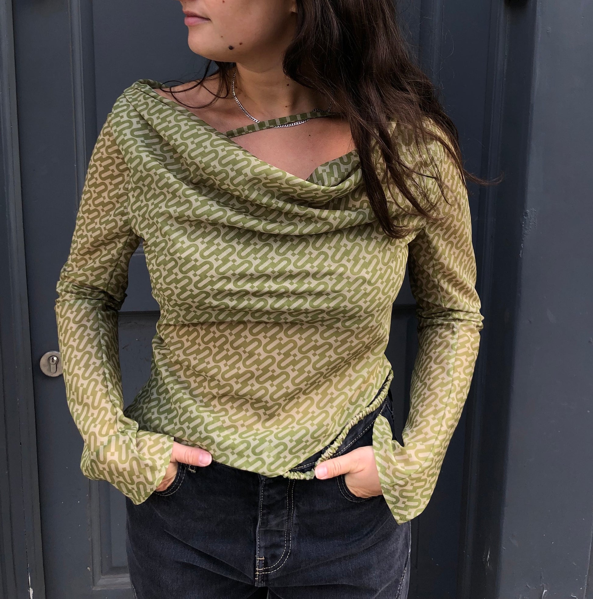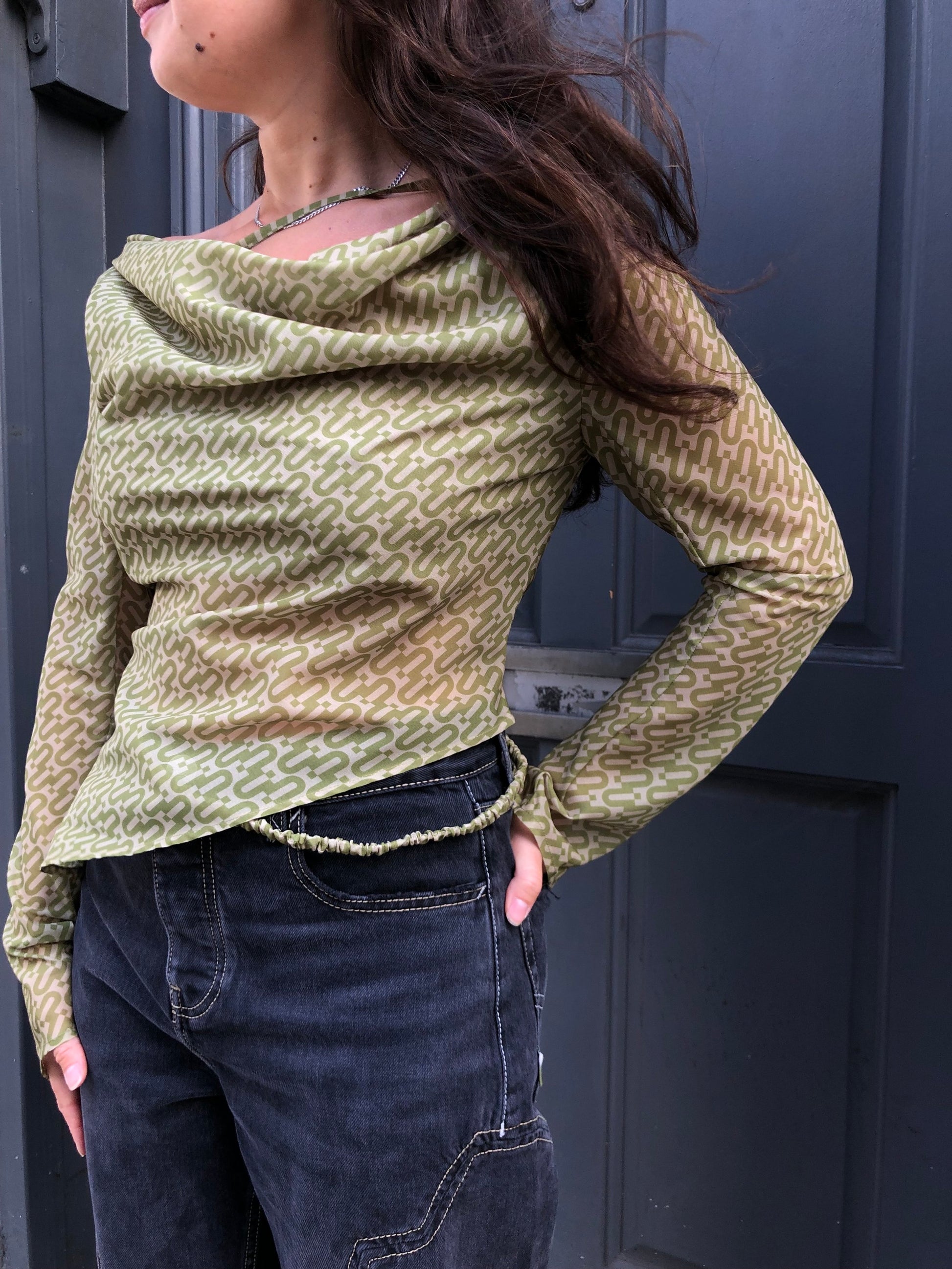 The Áine top features a bias cowl drape neckline, an elegant asymmetric hemline, fitted sleeves, and cross-body adjustable straps. Make a statement in this printed recycled georgette top.