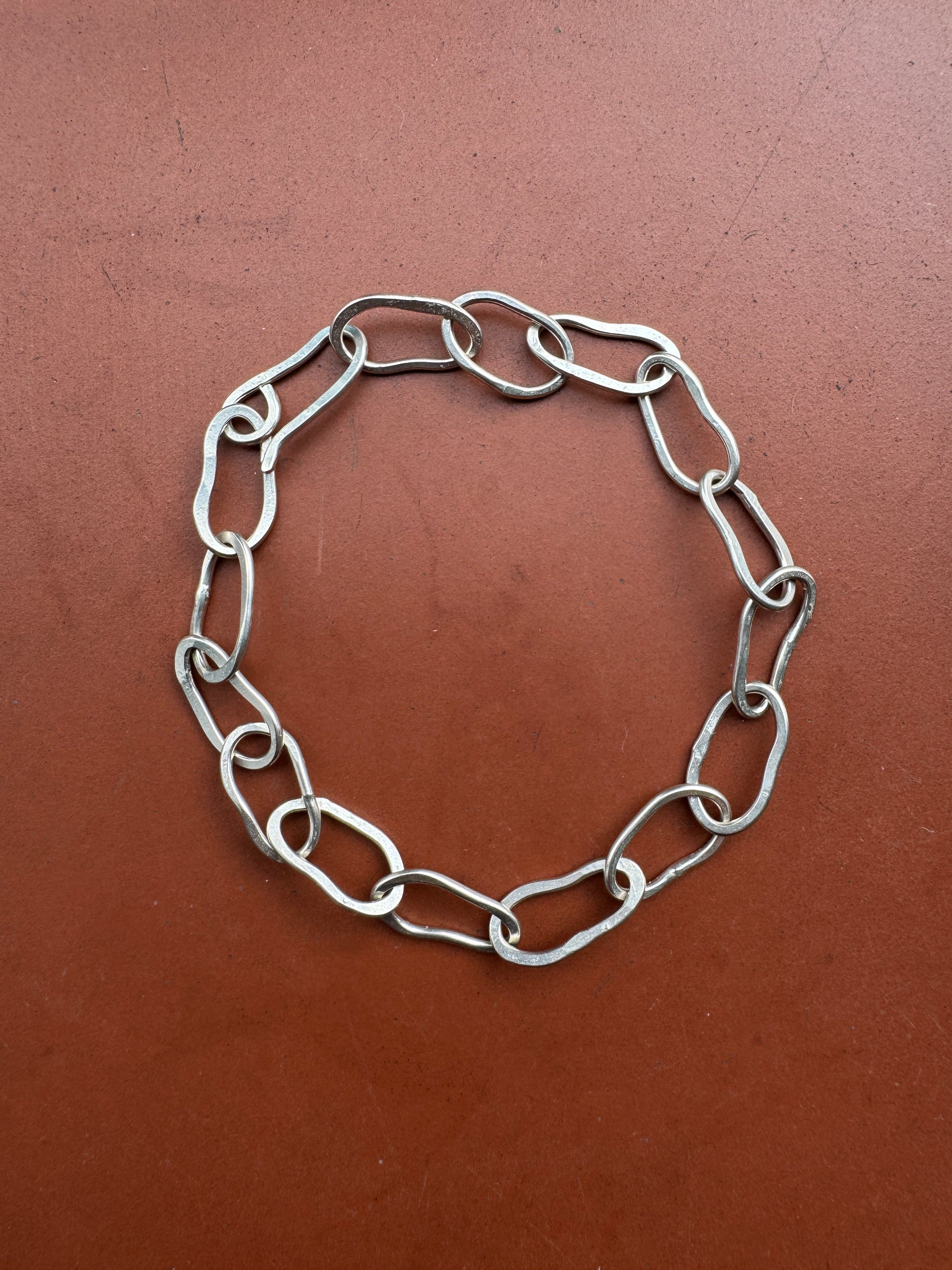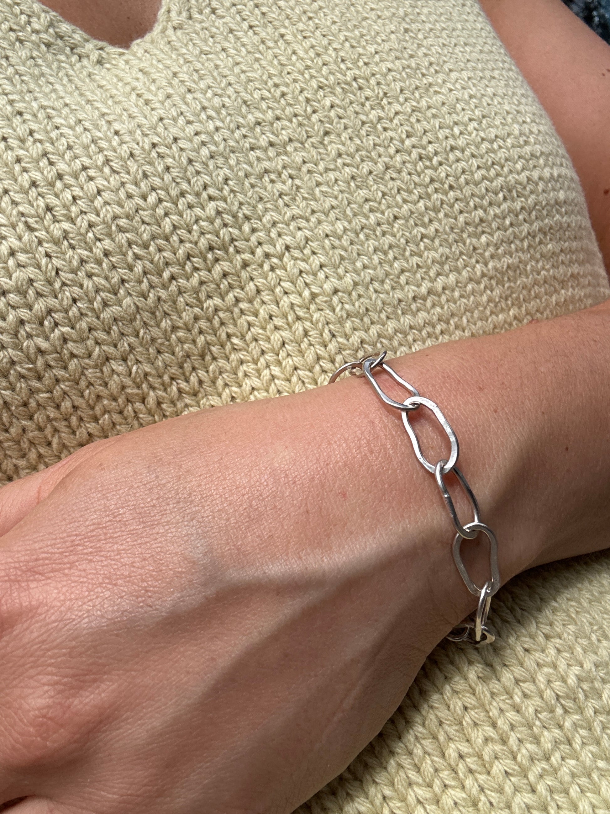 Hand-forged with care, each link in this bracelet is crafted from recycled metal, making every piece as unique as you are. The irregular, hammered finish gives it a distinct, artisanal feel that embodies the essence of sustainable craftsmanship.