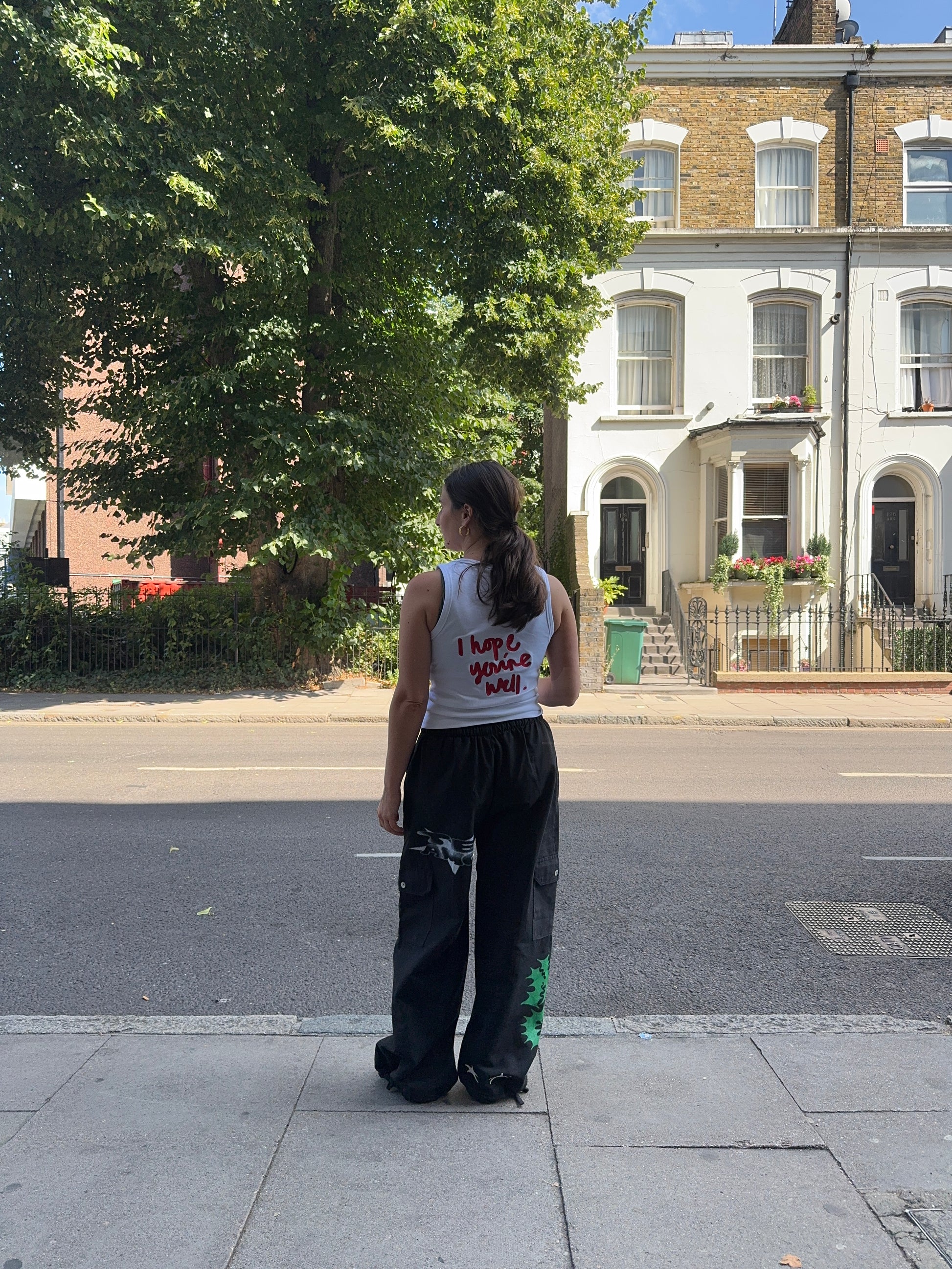 Designed with a wide-leg cut, a medium-rise drawstring waist, and four functional pockets, they’re perfect for both lounging and adventure. The side pockets feature luxurious mother-of-pearl buttons, while the adjustable drawstrings at the cuffs make them ideal for biking, hiking or simply being on the go