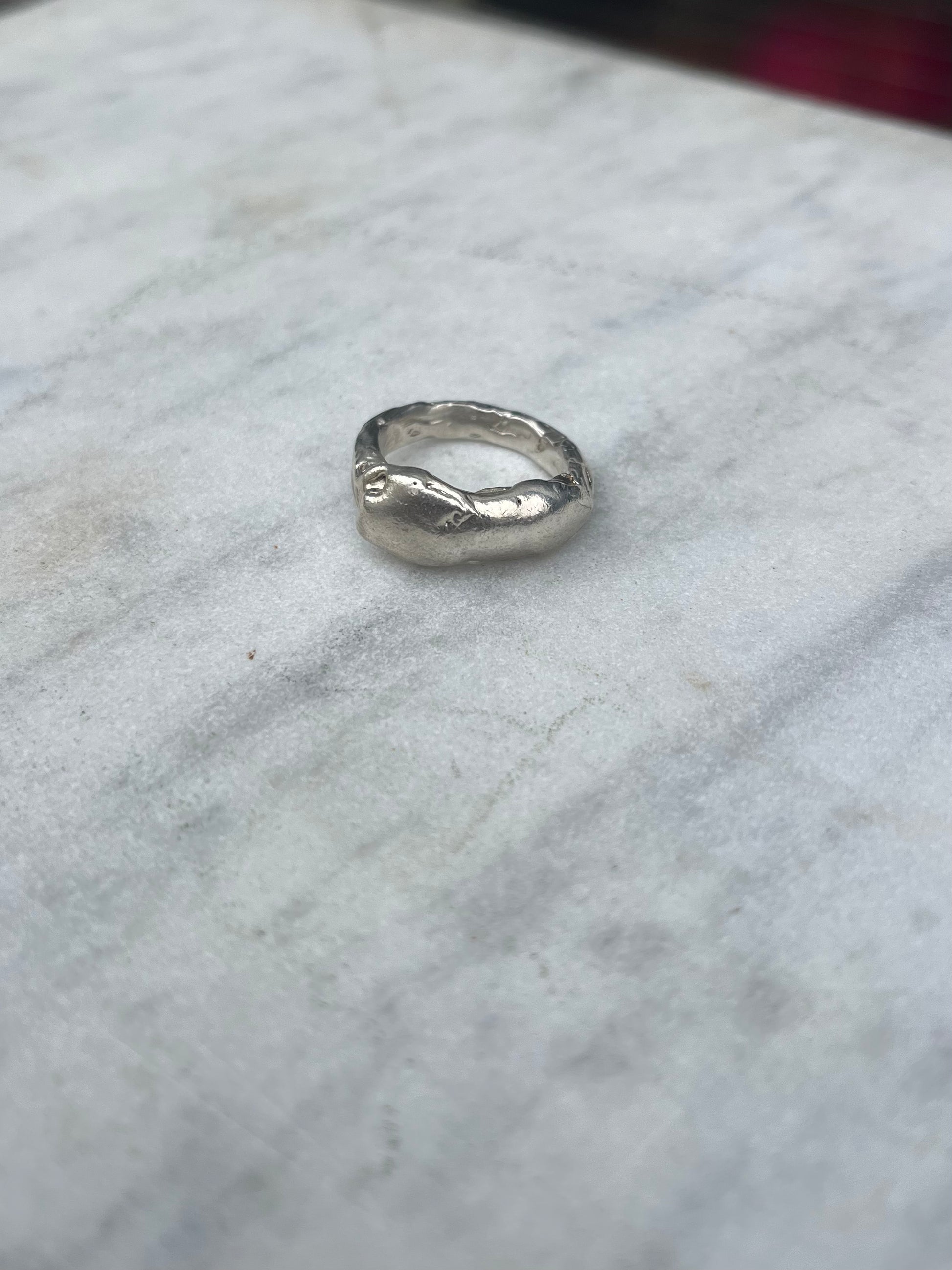Bold sterling silver ring with an organic shape.