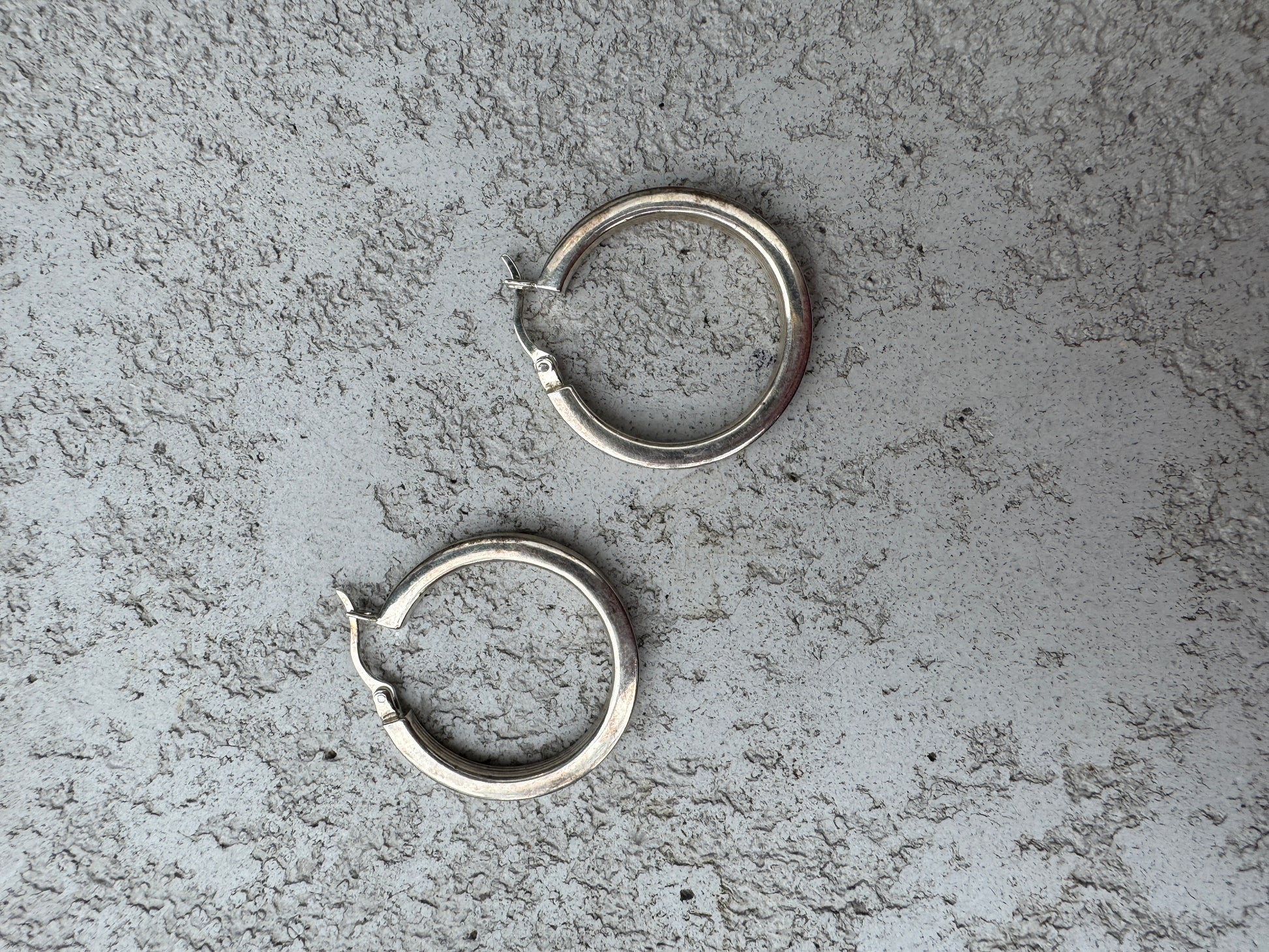Silver hoops with a textured ridge detail. These are vintage so may show some signs of wear.