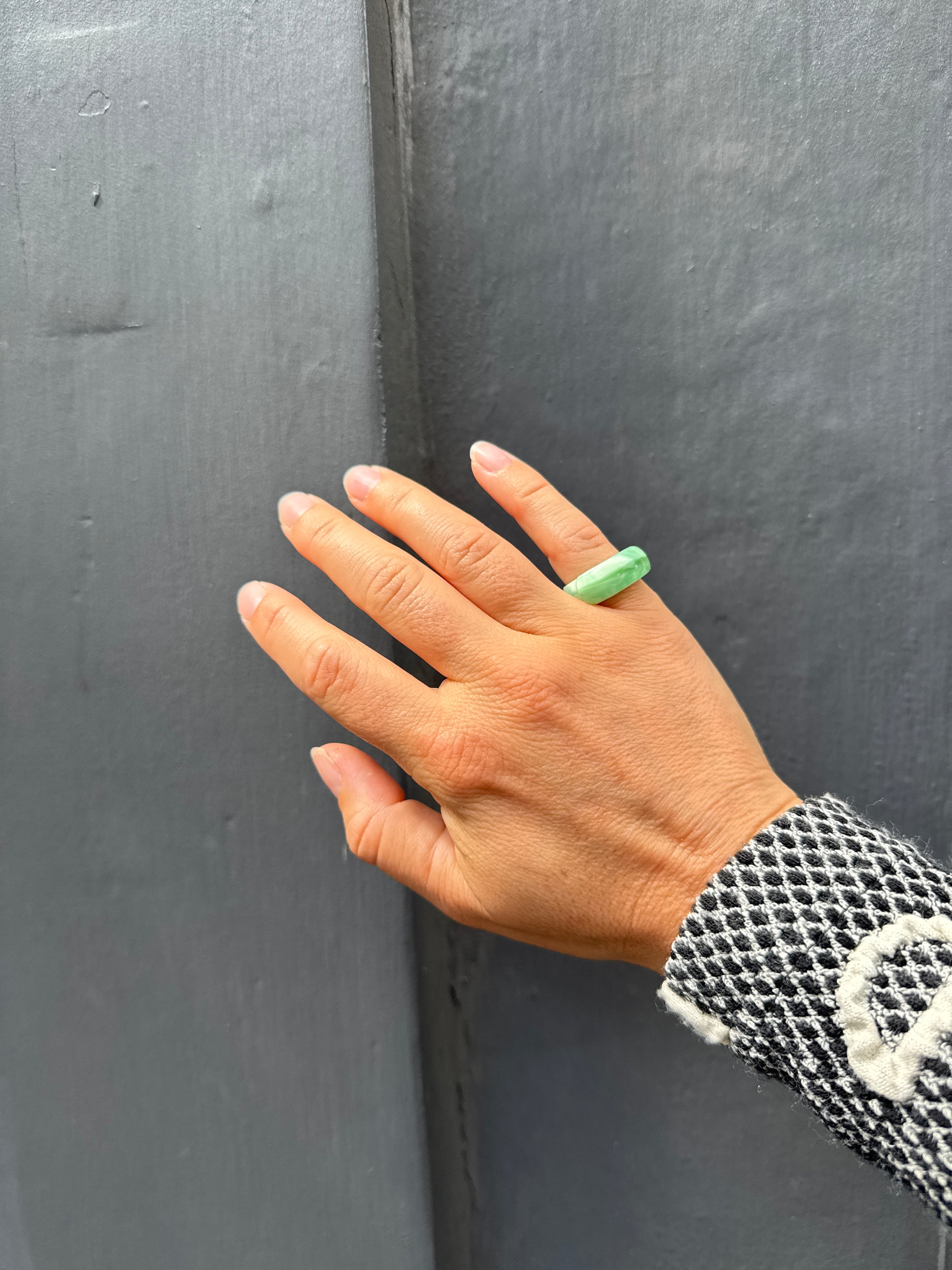 Green coloured glass ring. Size J