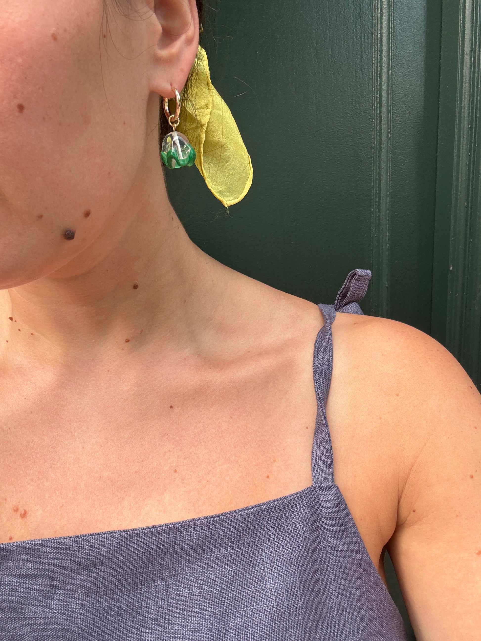 Vintage handmade clear molten glass, green lipped pendant earrings in pressed flower shape.