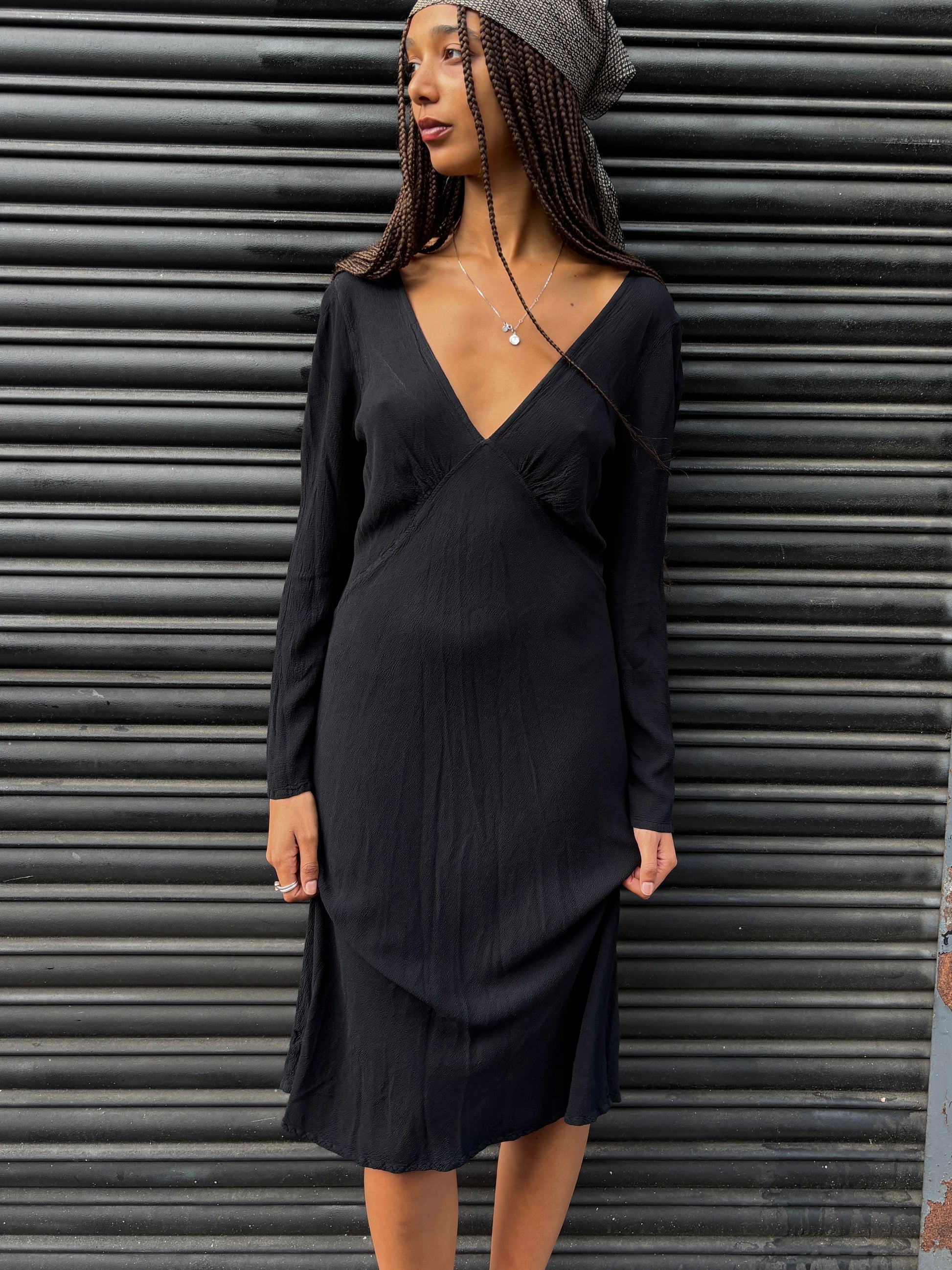 Ghost longsleeve dress. Cut on the bias, for a super flattering fit. Beautiful neckline, perfect for a pendant necklace!