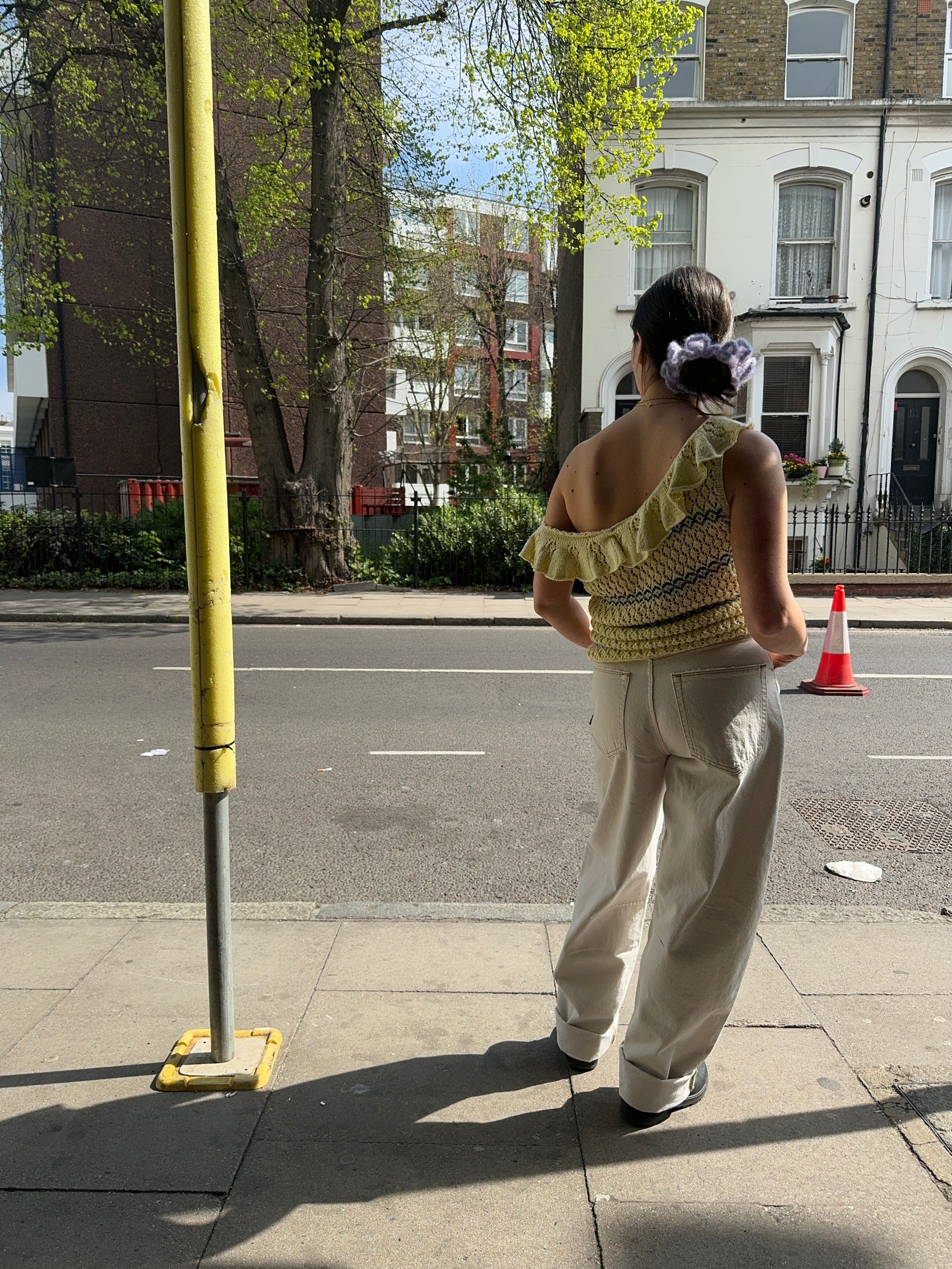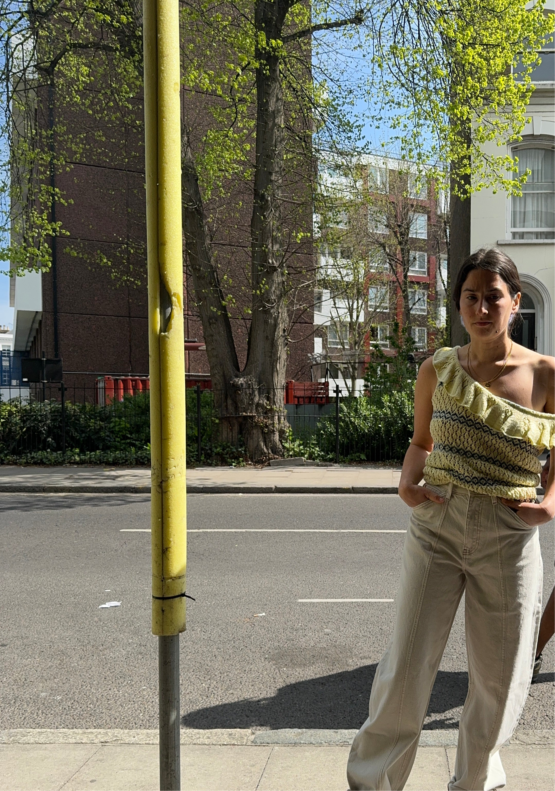 Hand knitted yellow top with frill detail, sourced by SK Vintage. Can be worn on or off the shoulder.