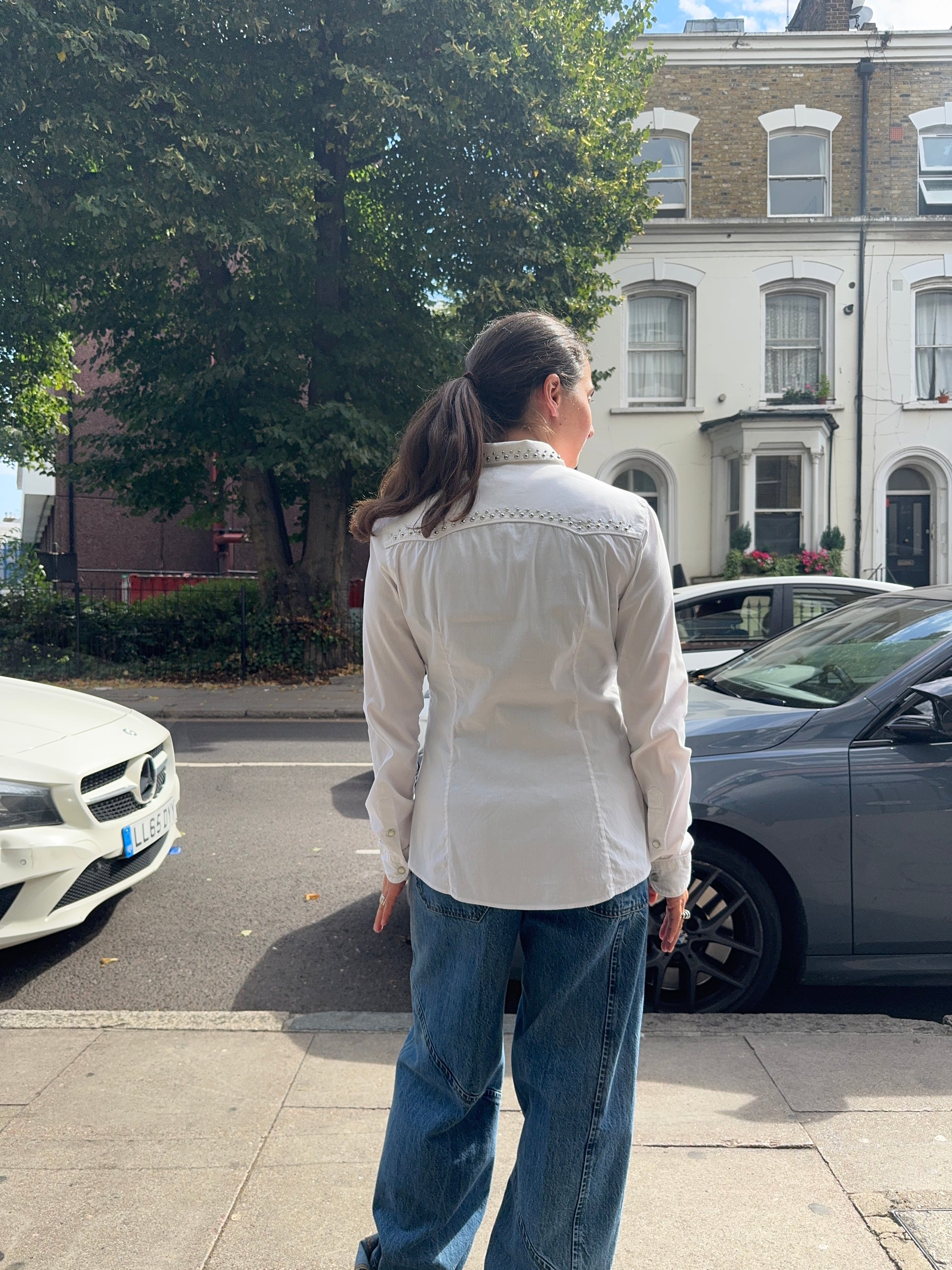 Prada studded western style shirt with dart detailing which makes it more fitted. As this item is vintage it may show some signs of wear.