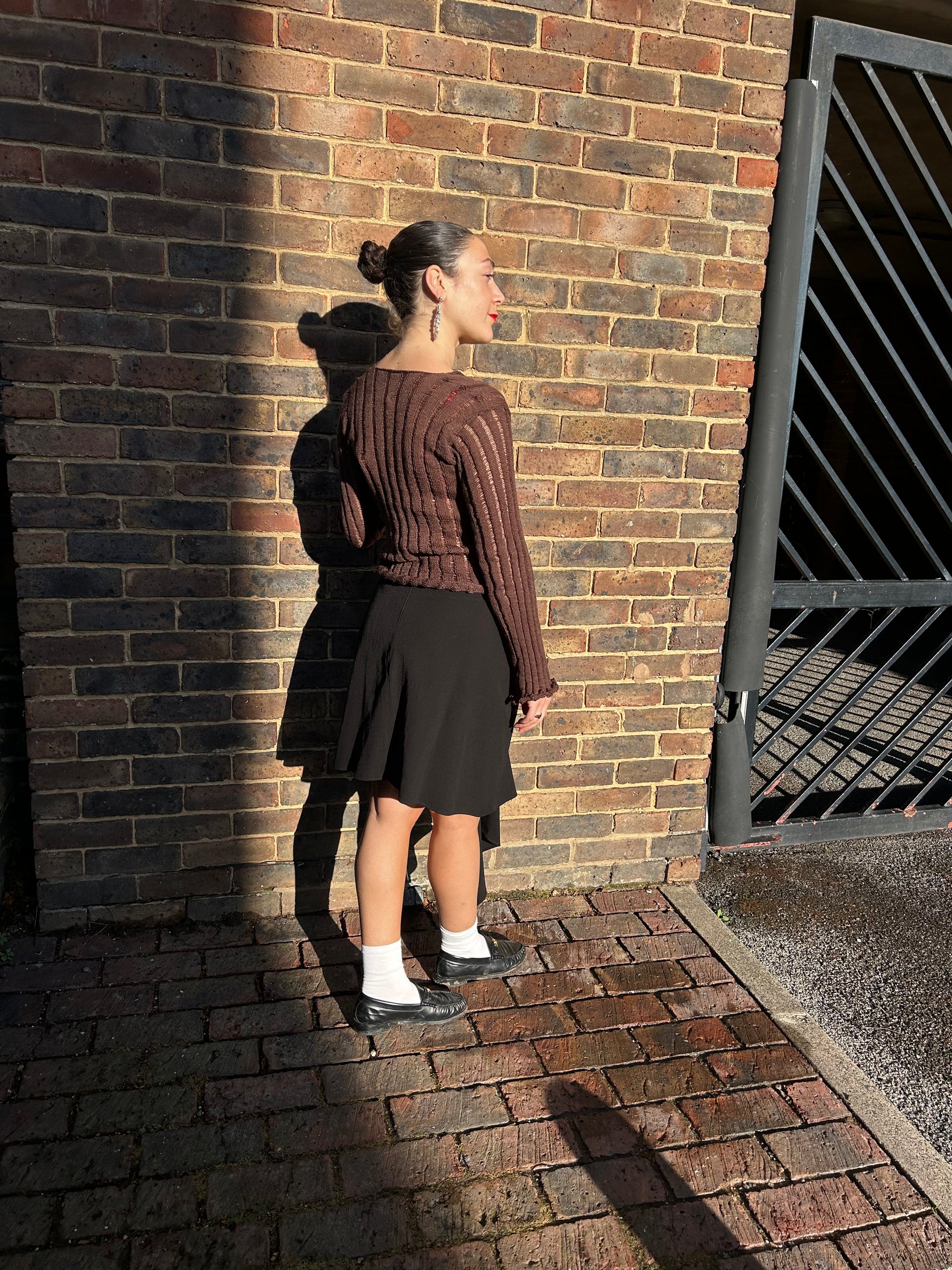 Brown knit cardigan with hook details at the centre front. Looks great with a pair of jeans.
