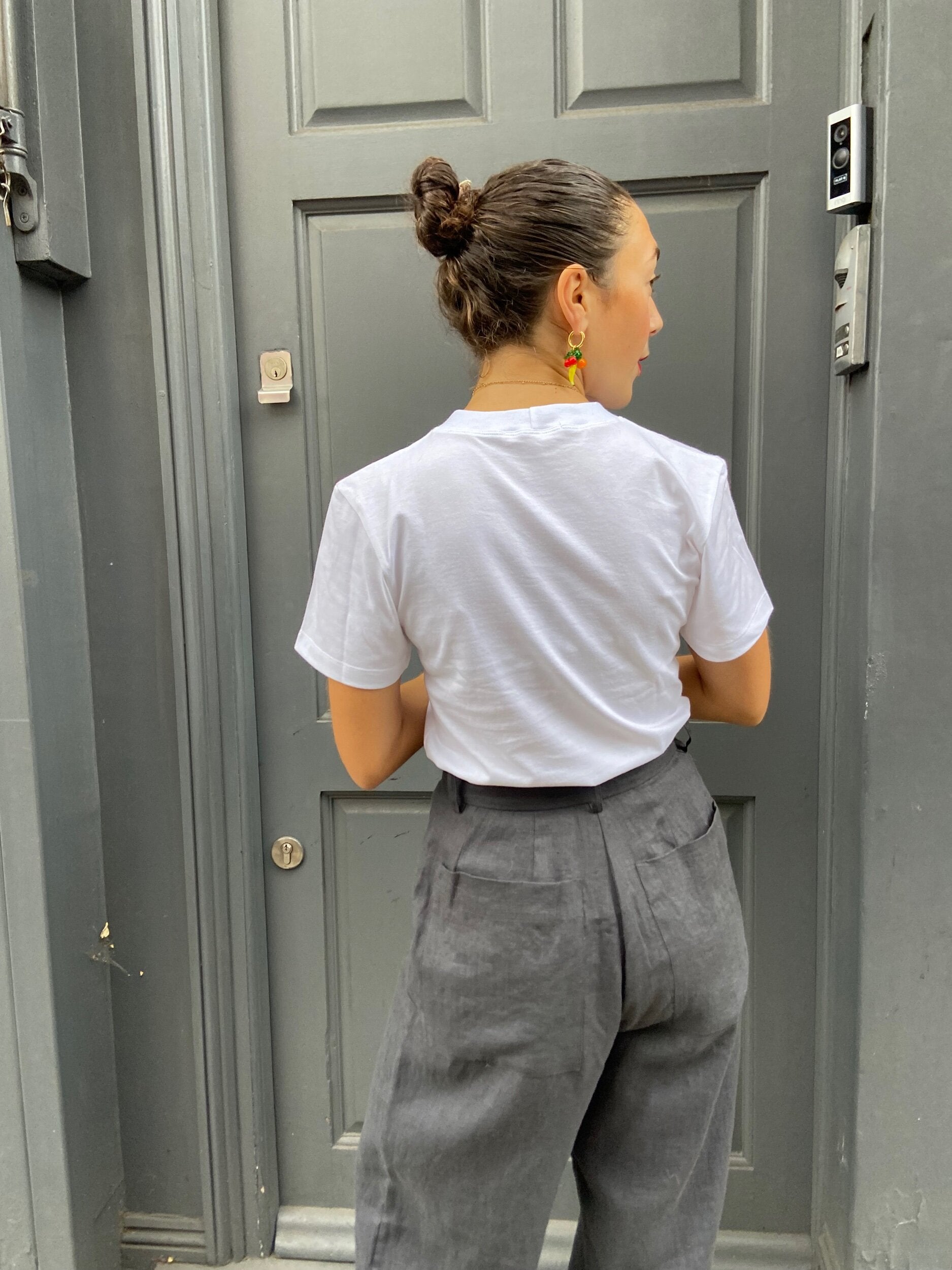 Fit -The perfect T-shirt for a relaxed yet sexy fit. With a ribbed neckline and short sleeves that sit mid-way down the upper arm, the seams have a slight curve to subtly highlight your waist. The length of the Tee comes to the hip bones. Embroidered with recycled thread.