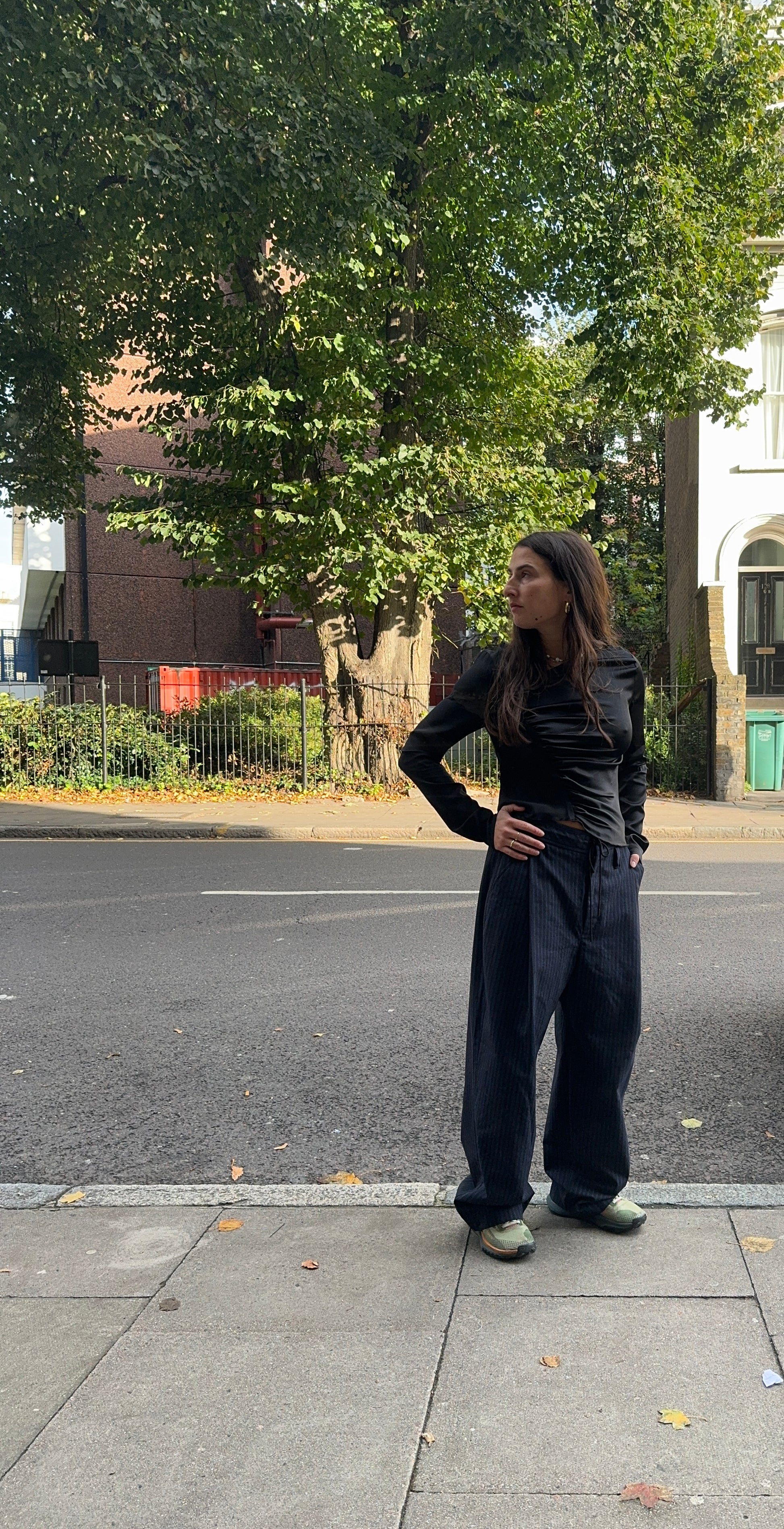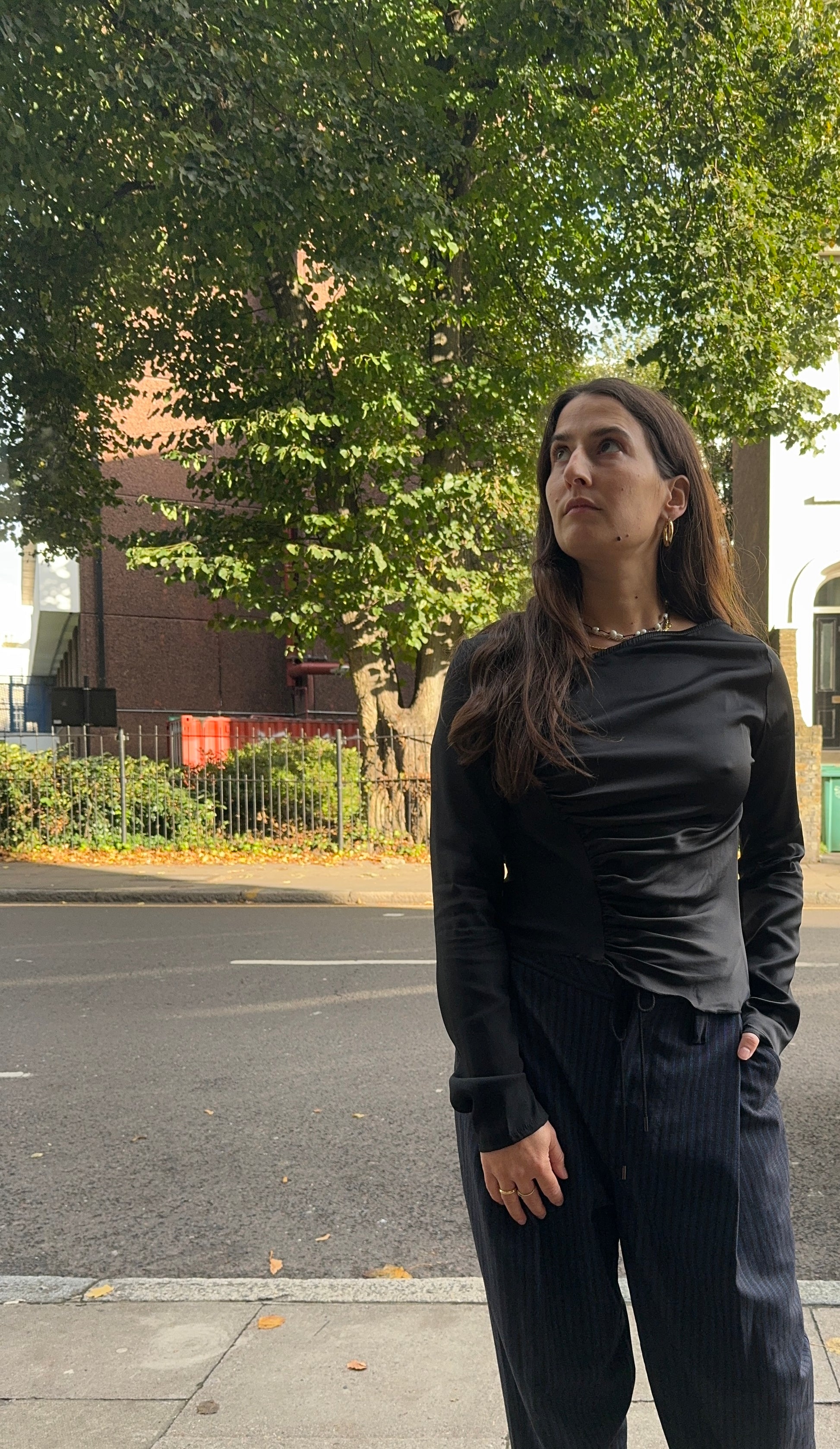 The Ríon top features an elegant asymmetric neckline, a subtle two-tone gathered bodice and fitted sleeves. This style is made from 100% stretchy silk crepe.